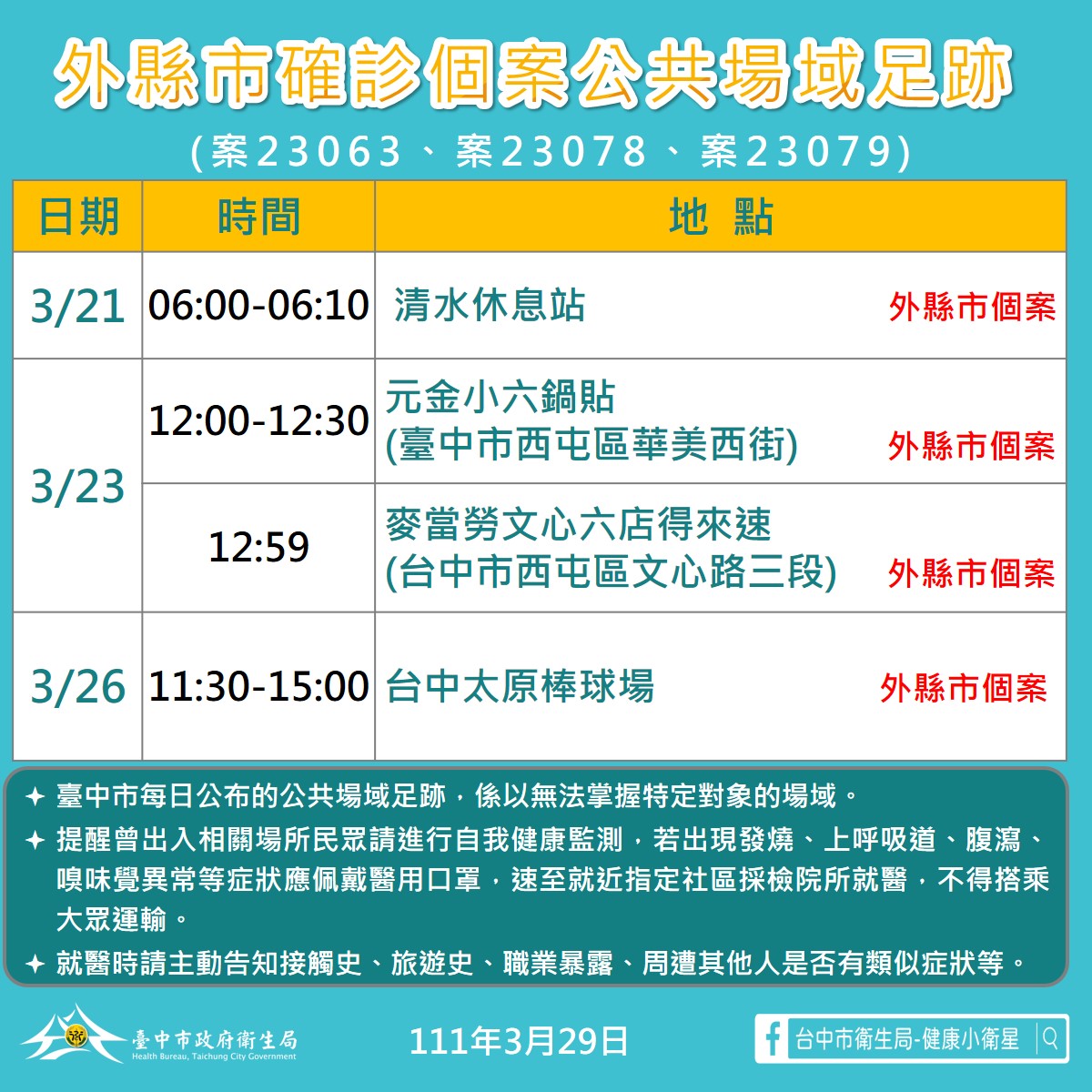 衛生局表示,市府接獲通知後立即展開疫調,3名個案分別曾於321日、23日、26日有台中市活動史,足跡分別有清水休息站、元金小六鍋貼、麥當勞文心六店得來速及太原棒球場,匡列相關友人及鍋貼店工作人員計15人安排PCR採檢皆陰性。