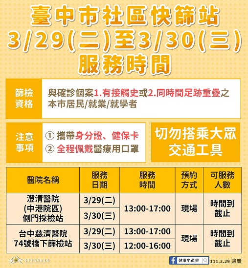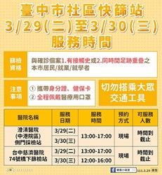 衛生局今明兩日於澄清醫院中港院區側門採檢站及台中慈濟醫院74號橋下篩檢站開設社區快篩站,另也針對同時間於元金小六鍋貼店內用餐的民眾發送實名制簡訊,請接獲簡訊或同時間足跡重疊的民眾,可前往快篩及監測自我健康狀況。