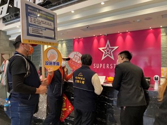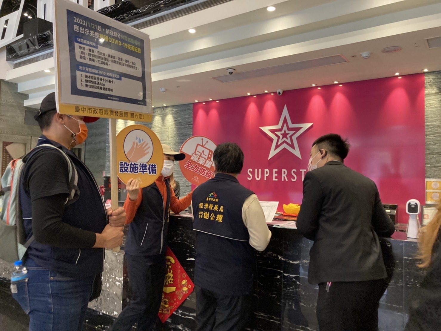 因應近期本土確診案例暴增、各地疫情升溫,台中市政府經濟發展局連續三日強化營業場所防疫宣導及查核,繼昨日前往百貨賣場宣導,今(4)日再度由專門委員謝公耀率隊前往超級巨星市政河南店,現場查核業者是否依據經濟部公告「視聽歌唱場所防疫管理措施指引」落實顧客管理以及從業人員健康管理等防疫措施。