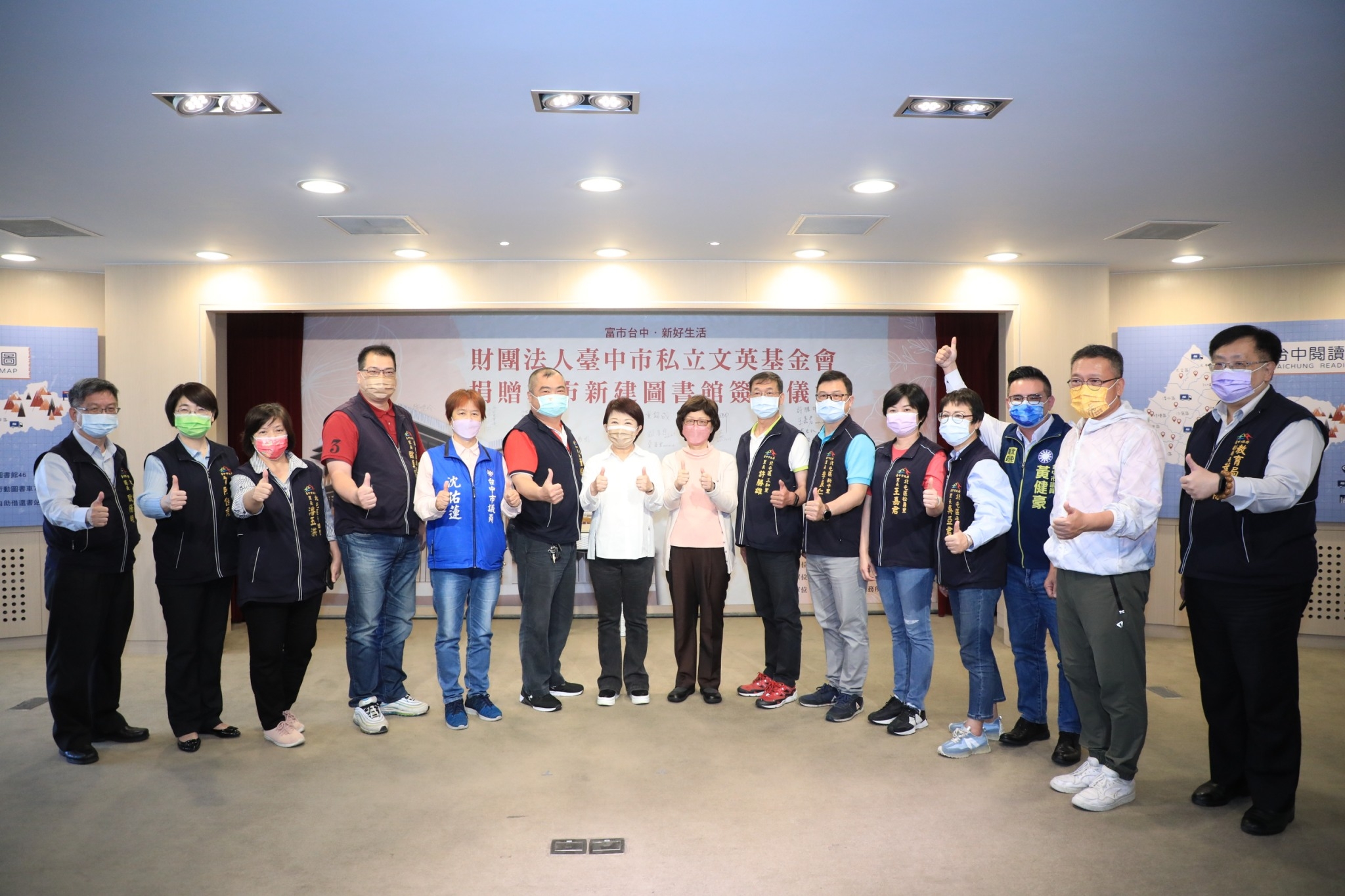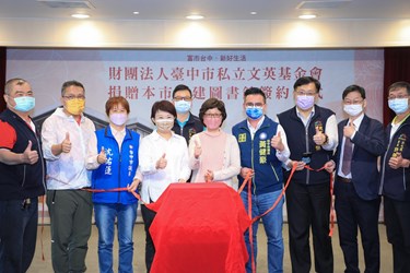 台中市政府攜手民間企業打造幸福閱讀城市!財團法人台中市私立文英基金會捐贈市府1億4,000萬元,將於北屯區文中小7用地、廍子國小旁新建公共圖書館「文英溪東圖書館」,為北屯區第4座、溪東地區第1座圖書館。「為善最樂、閱讀最好!」市長盧秀燕表示,感謝文英基金會允諾與市府攜手投入公共圖書資源及圖書館建設發展,照顧市府、提升市民權益與福祉。