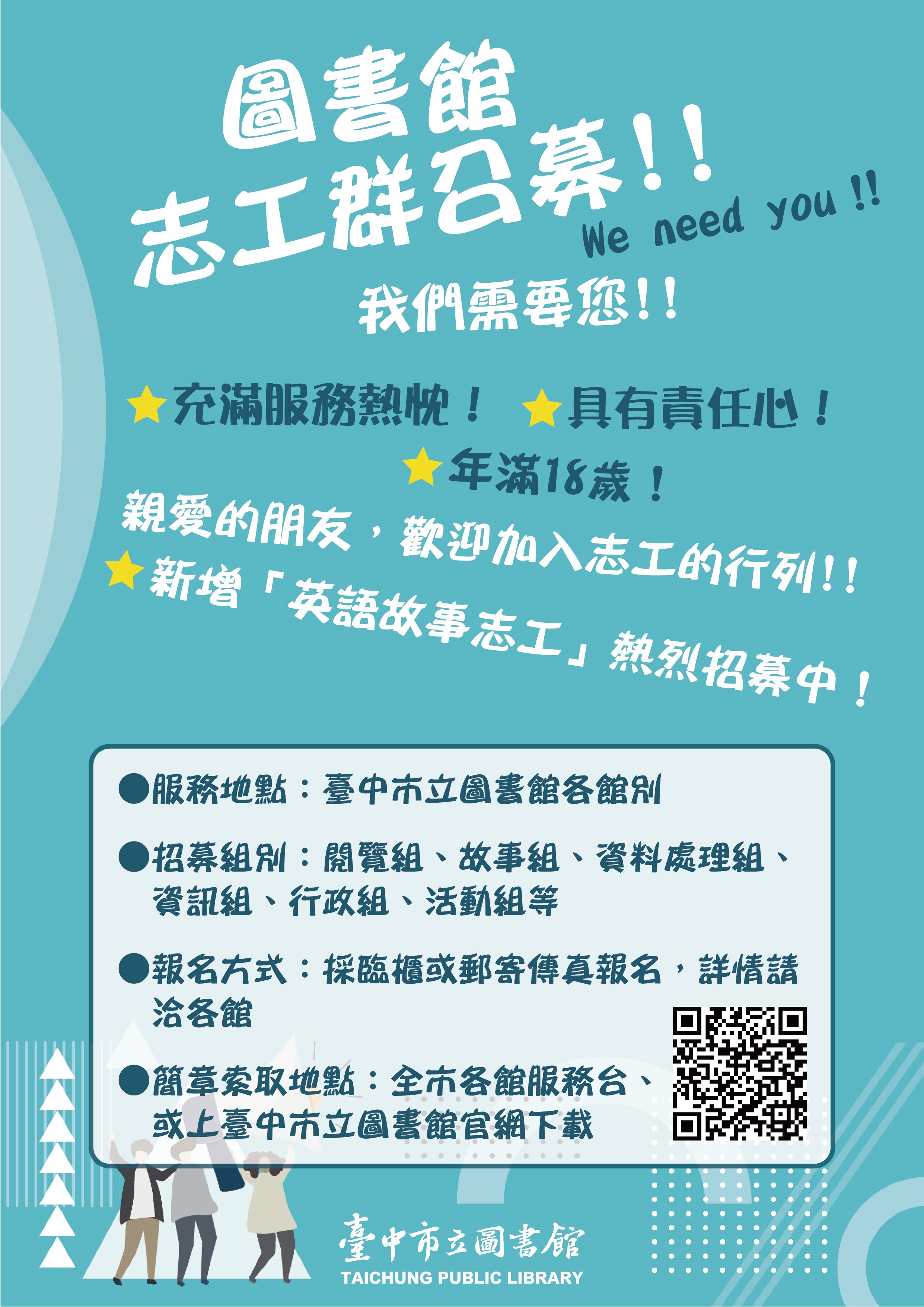 為提供民眾更貼心完善的閱讀服務,並為即將於今年開館營運的上楓分館及114年開幕的綠美圖,擴大招募志工團隊陣容,台中市立圖書館111年度志工招募即日起開跑,歡迎熱愛閱讀且具服務熱忱的民眾踴躍加入志工行列,一起打造台中幸福閱讀城市!
