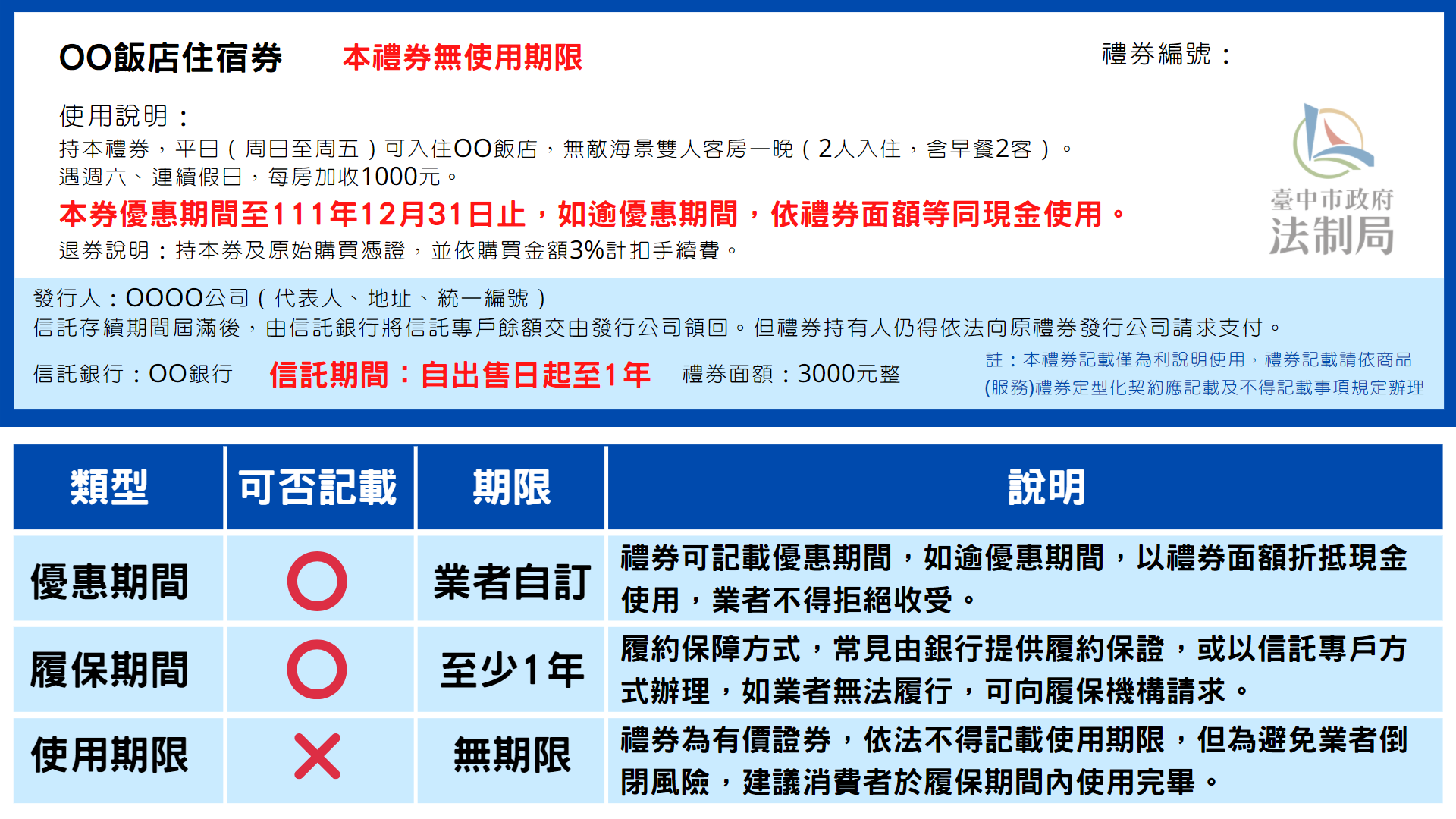 此外,禮券是消費者「先付款、後使用」的預付型商品,依規定不能記載使用期限;但有部分禮券會記載「優惠期間」,這是指業者依禮券提供特定商品或服務的期間,如面額800元禮券可兌換一客龍蝦套餐(門市價1000元),優惠期間6個月。若消費者未於優惠期間內使用,雖無法兌換禮券記載的指定商品,但仍可向業者主張依禮券面額當作現金使用,或請求退券。至於業者推出免費贈券的促銷活動,該贈品券則不適用前述的禮券規定,是可以「限定使用期限」。