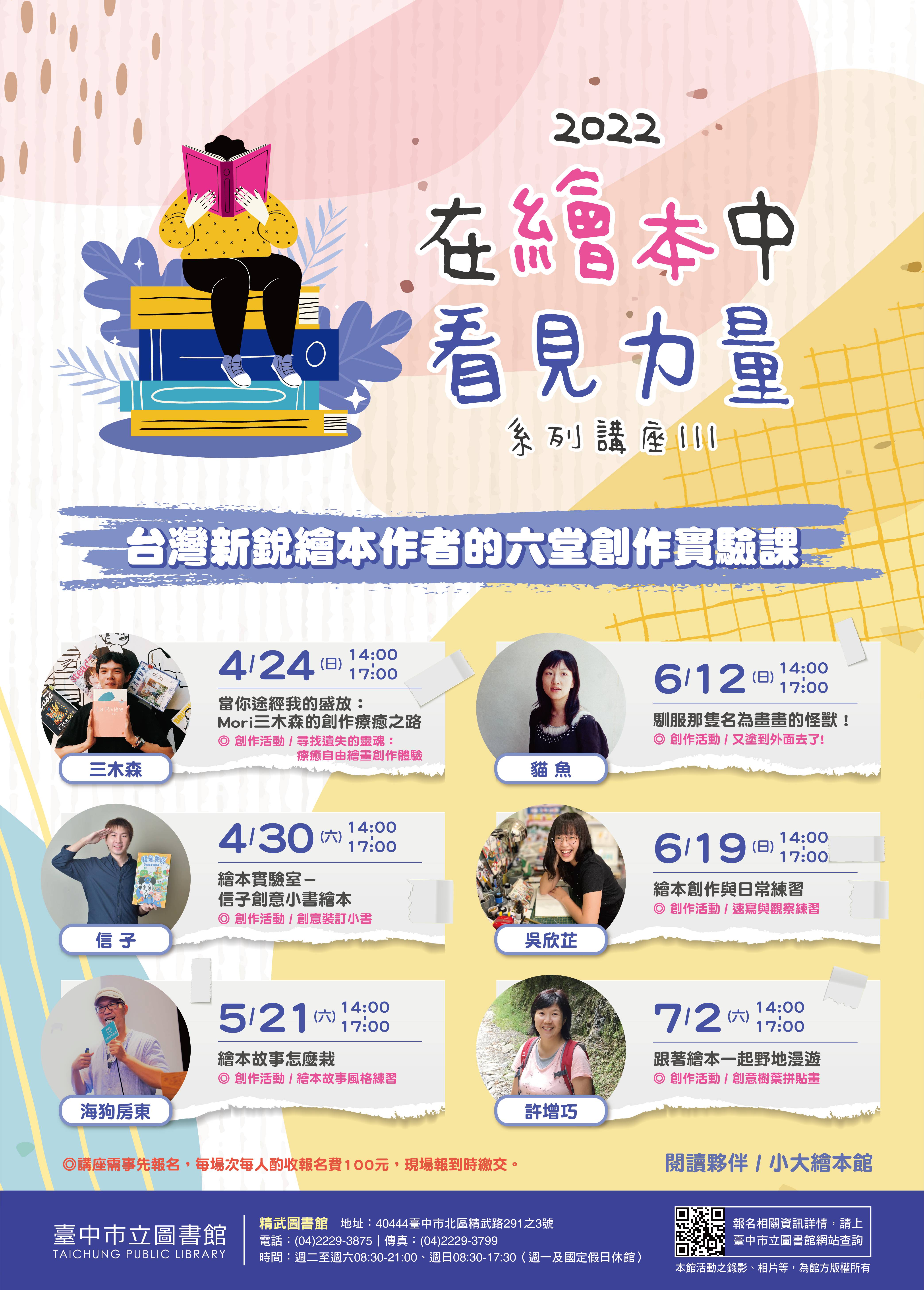 「台灣新銳繪本作者的六堂創作實驗課」系列講座,自4月24日至7月2日在精武圖書館推出,由台中市立圖書館與小大繪本館共同合作,邀請三木森、信子、海狗房東、貓魚、吳欣芷和許增巧等6位新世代繪本創作者,以繪本微型創作的實驗課程,分享繪本中的圖像與文字美感,以啟發學員對繪本創作的興趣與潛力,迴響熱烈。