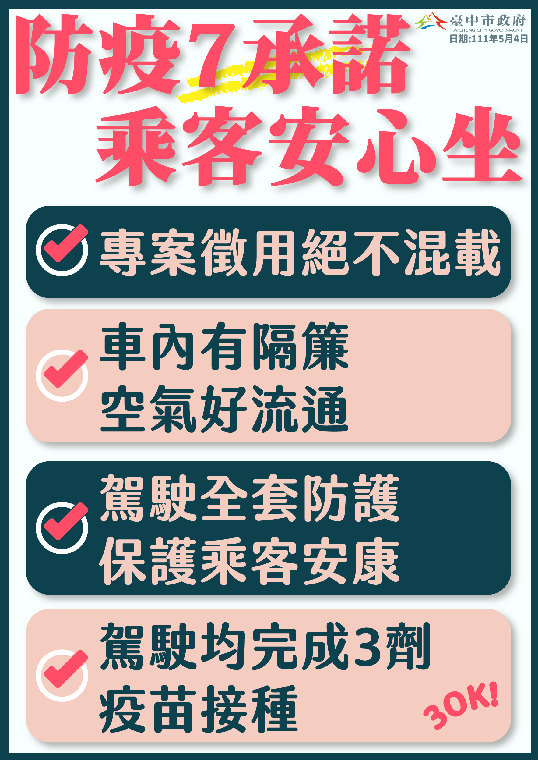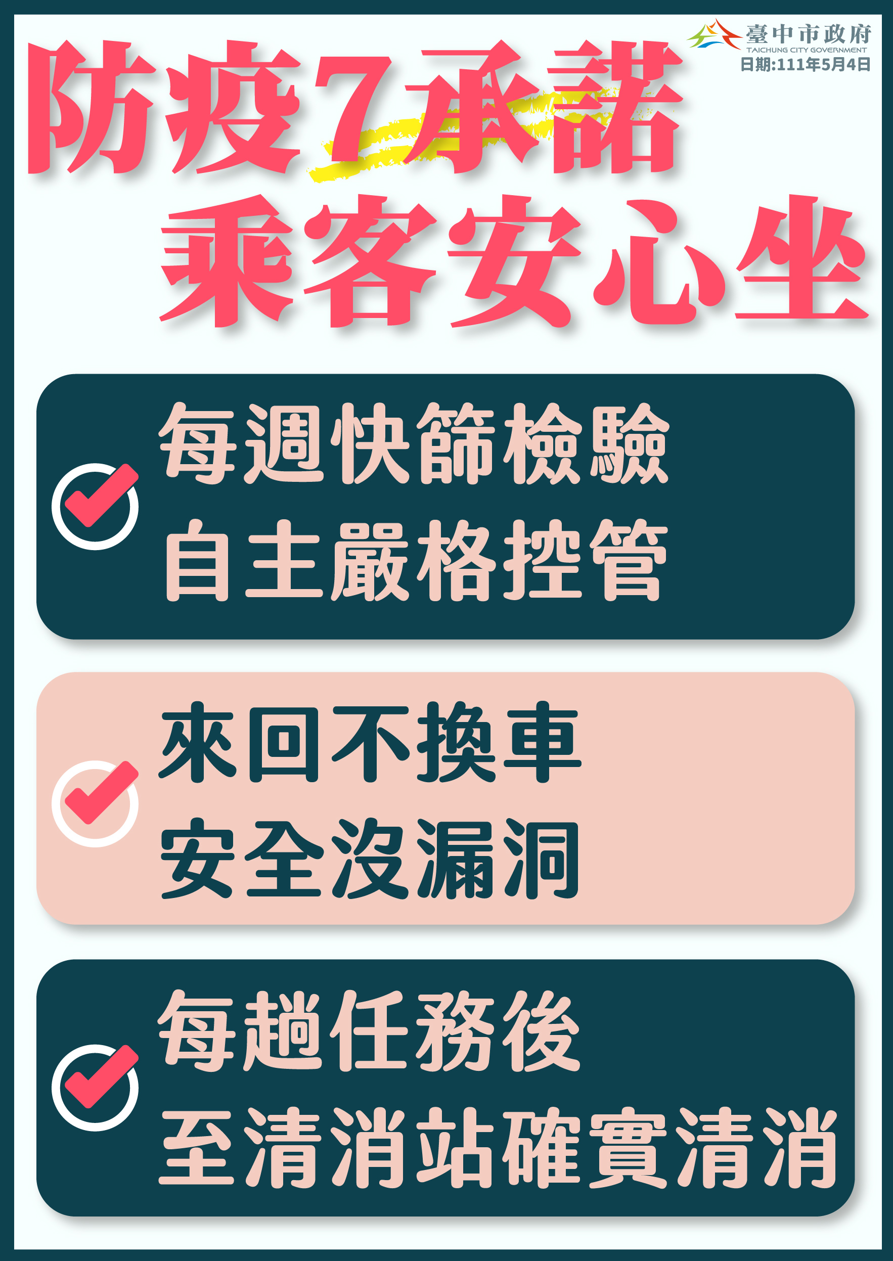 台灣大車隊台中分公司經理張森雄表示,防疫計程車車隊提供7項承諾,讓乘客安心搭乘,包括專案徵用,不會與一般乘客混載;車內有隔簾,保持空氣流通;提供駕駛全套防護,如頭套、面罩、N95口罩、防護衣、酒精等,事前並辦理衛教訓練;每位駕駛均完整接種3劑疫苗;要求駕駛每周完成自主快篩,並將檢驗結果呈報;載個案來回不換車,中途不會再載其他乘客;每趟任務後,至清消站確實清消。