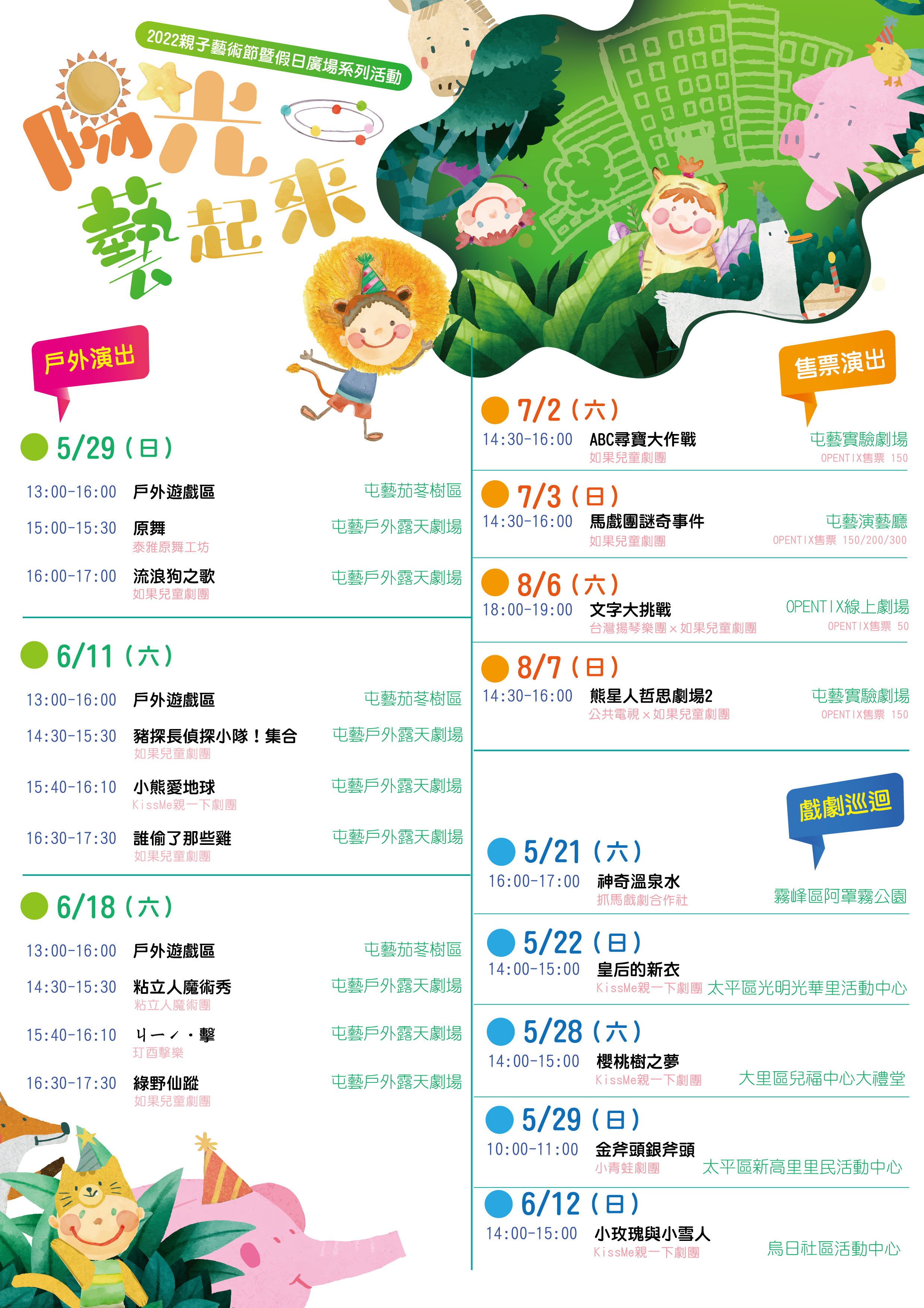 台中市屯區藝文中心「2022親子藝術節暨假日廣場系列活動」5月熱鬧登場!今年以「陽光藝起來」為主題,自5月21日至8月7日,將有室內劇場、戶外露天劇場及戲劇巡迴等多場演出,並結合戶外廣場推出系列親子節目和遊戲區,歡迎民眾參與多采多姿的藝文體驗,感受兒童劇魅力。