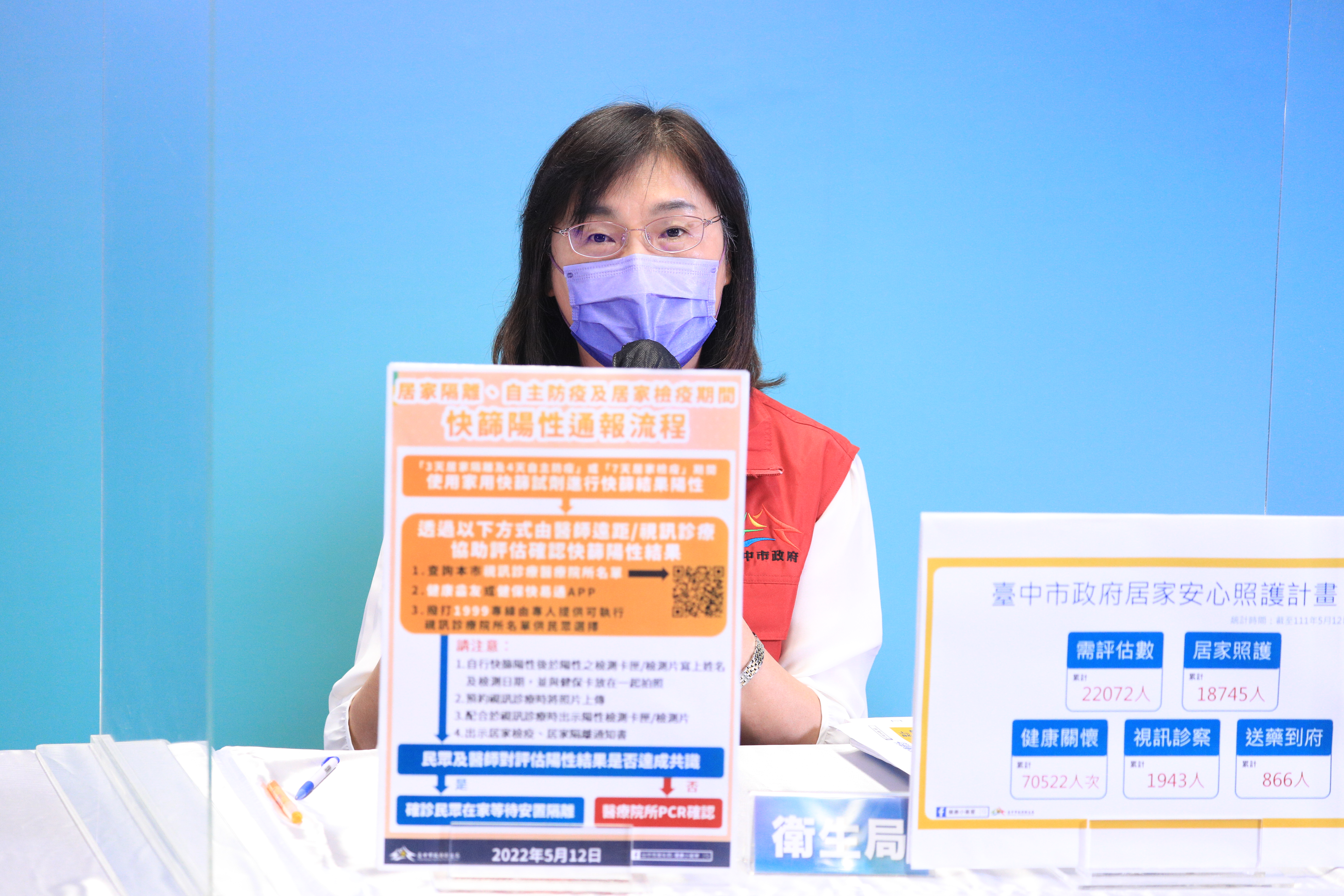 衛生局副局長邱惠慈說明,今天是中央通報居家隔離、自主防疫、居家檢疫這「三類對象快篩陽性,經醫事人員判定確診」首日,其通報流程為「3天居家隔離及4天自主防疫」或「7天居家檢疫」期間使用家用快篩試劑結果陽性後,有3種方法可找到醫師遠距(視訊)診療協助評估是否確診,一為透過衛生局官網查詢台中市視訊診療院所名單,二為使用「健康益友」APP、健保快易通APP查詢,三為撥打1999專線,由專人提供可執行視訊診療院所名單。