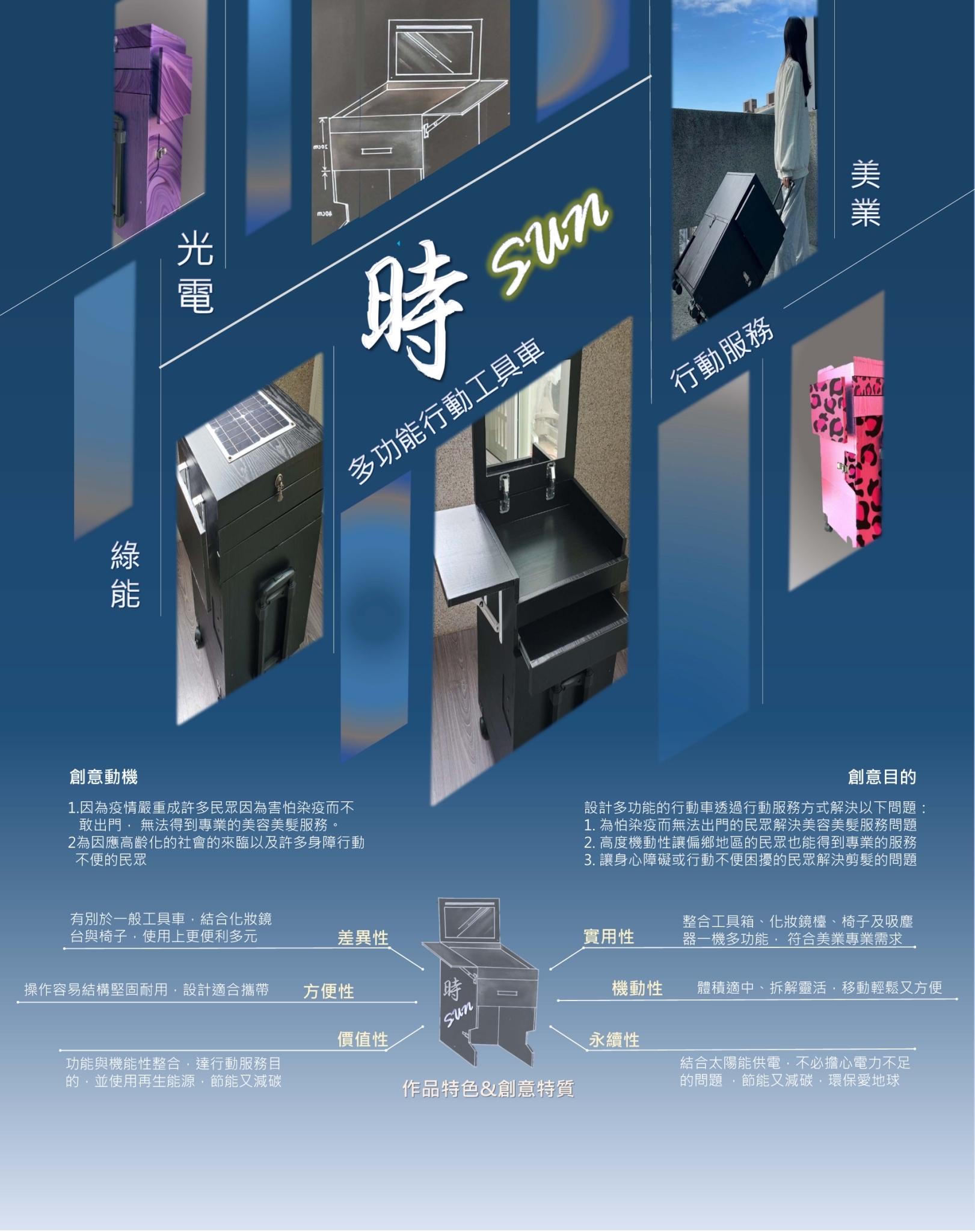 教育局提到,明德高中邱宣喻、黃筠淇、王映竹三位同學以「時 SUN-光電行動工具車」榮獲家政群科創意組全國第1名,近年因新冠疫情蔓延造成學校停課,這三位同學發現人們因此不敢出門整理頭髮,許多美髮沙龍業績一落千丈,人們也無法享受良好的美髮服務,因此他們萌生了想要設計一台可以提供行動服務的工具車,讓設計師不侷限服務場所,也可因應現代高齡化老人照護服務的需求,在具有創意生活設計、造型藝術及美工設計專長的林宇倩主任、鄭全易老師的指導下,透過跨領域的師生學習,從工具車的結構設計、木工的技術指導,再透過網路學習太陽能發電的原理與配電的技巧,從設計圖、製作模型、材料的採購與裁切,經過多次的失敗檢討與修正,終於組裝完成獨一無二的光電多功能行動工具車。