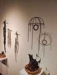 今日開幕式共有一百餘位參展校系師生與會,彼此分享交流創作經驗。目前就讀於南藝大材質創作與設計系連結應用藝術研究所林寶如同學,談到她的參展作品〈梭蒔〉說:「當談到生態的環保議題時,沉默的植物很容易被忽視,所以我幻想數百年後地球植物生成的模樣,在雙層織技法梭織的過程,讓一圈圈獨一無二的線材,化為植物的生長。」彰師大美術系畢業生施慶餘則以壓克力作品〈軌跡〉,反映記憶與創作軌跡的交疊,「人是透過記憶堆疊起來的,不同記憶彼此之間的連結,也構成人的主體。〈軌跡〉以多個方形畫布作為載體,畫與畫之間的連結是創作的軌跡,也是自我的探討。」