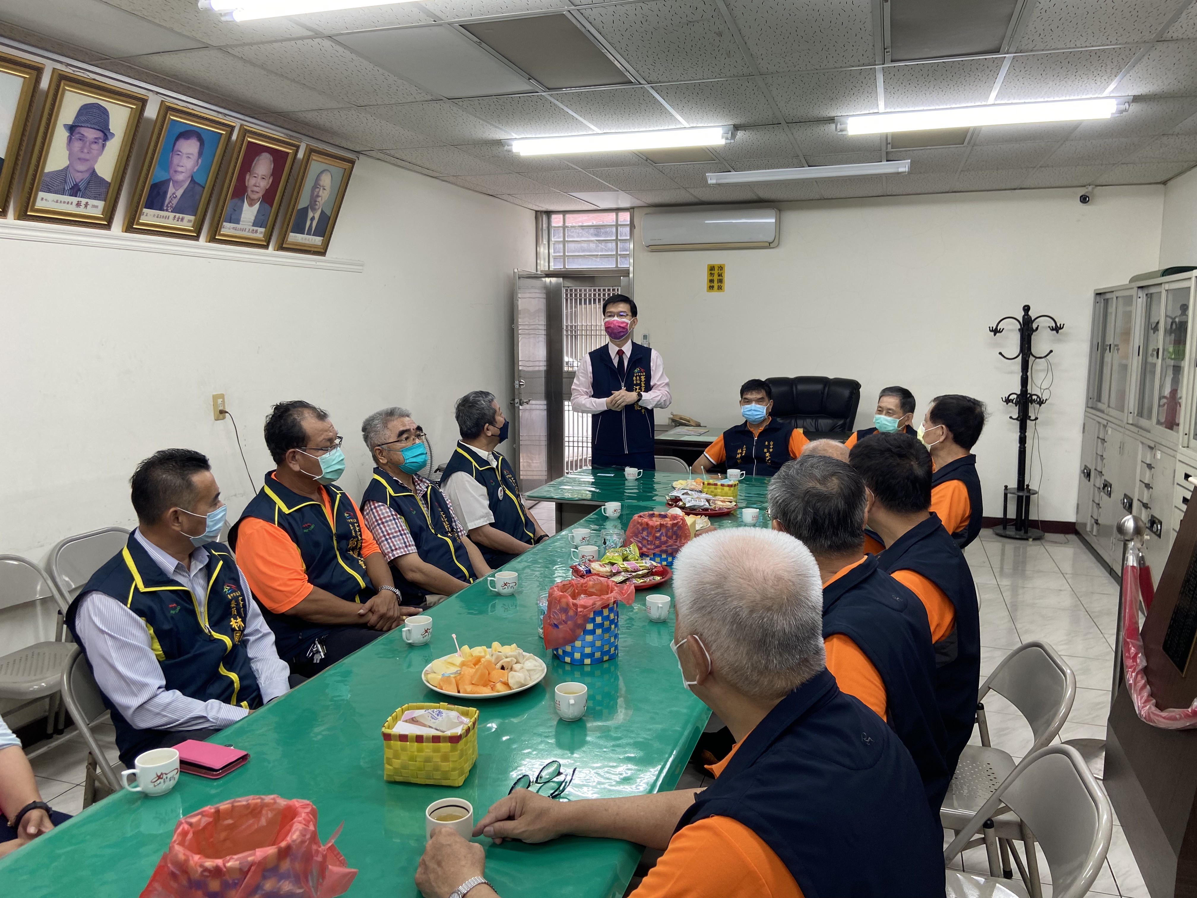 江主委一早便率客委會委員和同仁抵達天乙宮,先和廟方主委林坤熙及三位副主委、總幹事等全體幹部、志工座談,並代表盧市長祝福天乙宮宮務昌隆、會務順利,隨後一同上香獻禮祝壽,預祝端午佳節快樂,也祈求疫情儘早結束。