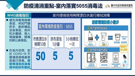 環保局說明,為減少市民連假期間外出聚餐染疫風險,除呼籲餐飲業者注意保持室內通風外,西屯區何成里田里長特與環保局一起向里內小吃店家宣導室內防疫清消作法,即掌握「5055」口訣,使用市售漂白水稀釋50倍(使用1瓶蓋約20cc的漂白水加980cc清水),抹布浸泡5分鐘,每5小時擦拭一次,就可降低病毒傳染機會。