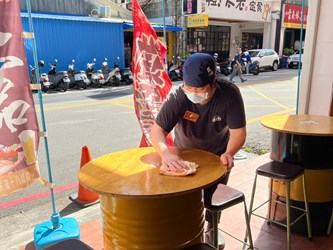 森川丼丼大橋橫町廖店長說,為提供客人安心用餐環境,用餐完畢立即以酒精擦拭消毒,休息時間也再以稀釋漂白水進行全面擦拭。台西肉圓小吃店的林老闆娘表示,店內保持通風良好,每日營業前以酒精擦拭消毒,一有空檔就會加強消毒,以維持乾淨用餐環境。餃夠味手工水餃專賣店的蔡老闆娘說,每日營業前會依據里長及環保局推廣的5055消毒法,使用稀釋漂白水擦拭店內環境,且定期清洗桌面擋板,民眾可安心前往用餐。