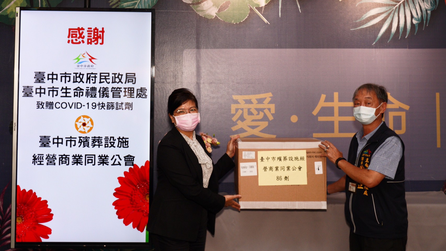 新冠肺炎疫情延燒,為維護防疫量能,市長盧秀燕近期啟動「溫暖助防疫」發送快篩計畫,今(15)日起陸續配發快篩試劑至台中市葬儀商業同業公會、台中市直轄市葬儀商業同業公會及台中市殯葬設施經營商業同業公會等3家公會,配發所屬公會會員共452家業者每家4劑快篩,並額外加碼提供3家公會共650劑快篩,共準備2,458劑,關懷台中市殯葬業者健康。