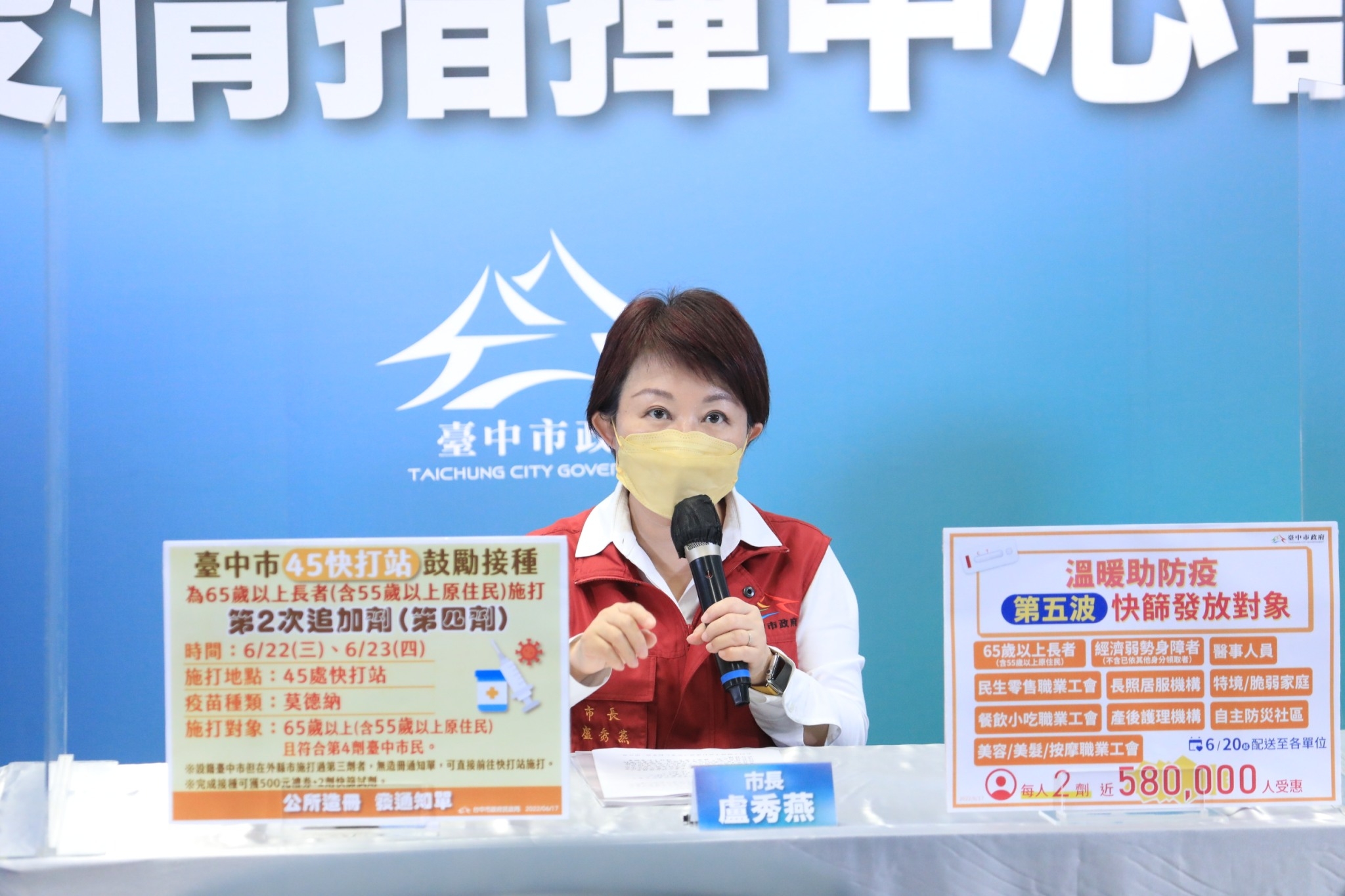 全國今(17)日新增本土確診55,187例,台中市新增8,323例,其中7,845例為快篩陽確診,佔94.26%。市長盧秀燕今日於疫情線上記者會宣布,市府啟動第五波快篩試劑發放計畫,預計下週一620日起,針對65歲以上長者(含55歲以上原住民)、醫事人員、經濟弱勢身障者、民生零售職業工會、長照居服機構、特境及脆弱家庭、美容美髮按摩職業工會、產後護理機構、自主防災社區、餐飲小吃職業工會等十類人員,發放每人兩劑,約58萬人受惠。