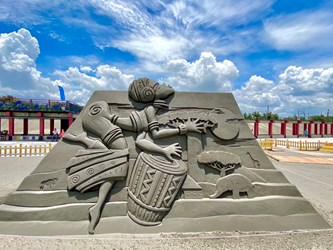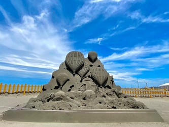 今年的合影熱點是高近4公尺的主雕「大安啟航環遊世界之旅」,還有入口的「卡帕多奇亞熱氣球飛行」,精湛的雕刻技術,將大自然鬼斧神工的美景及繽紛熱氣球的精彩完美呈現,而出口處的「瑞士真實版笑笑羊」也是拍照打卡人氣王,180度環視藝術沙雕,背後的小羊更是沙雕師別具匠心的巧思,為落實防疫,今年特別規劃飲食專區供遊客使用,感謝民眾配合防疫,共同創造安心賞沙雕的環境。