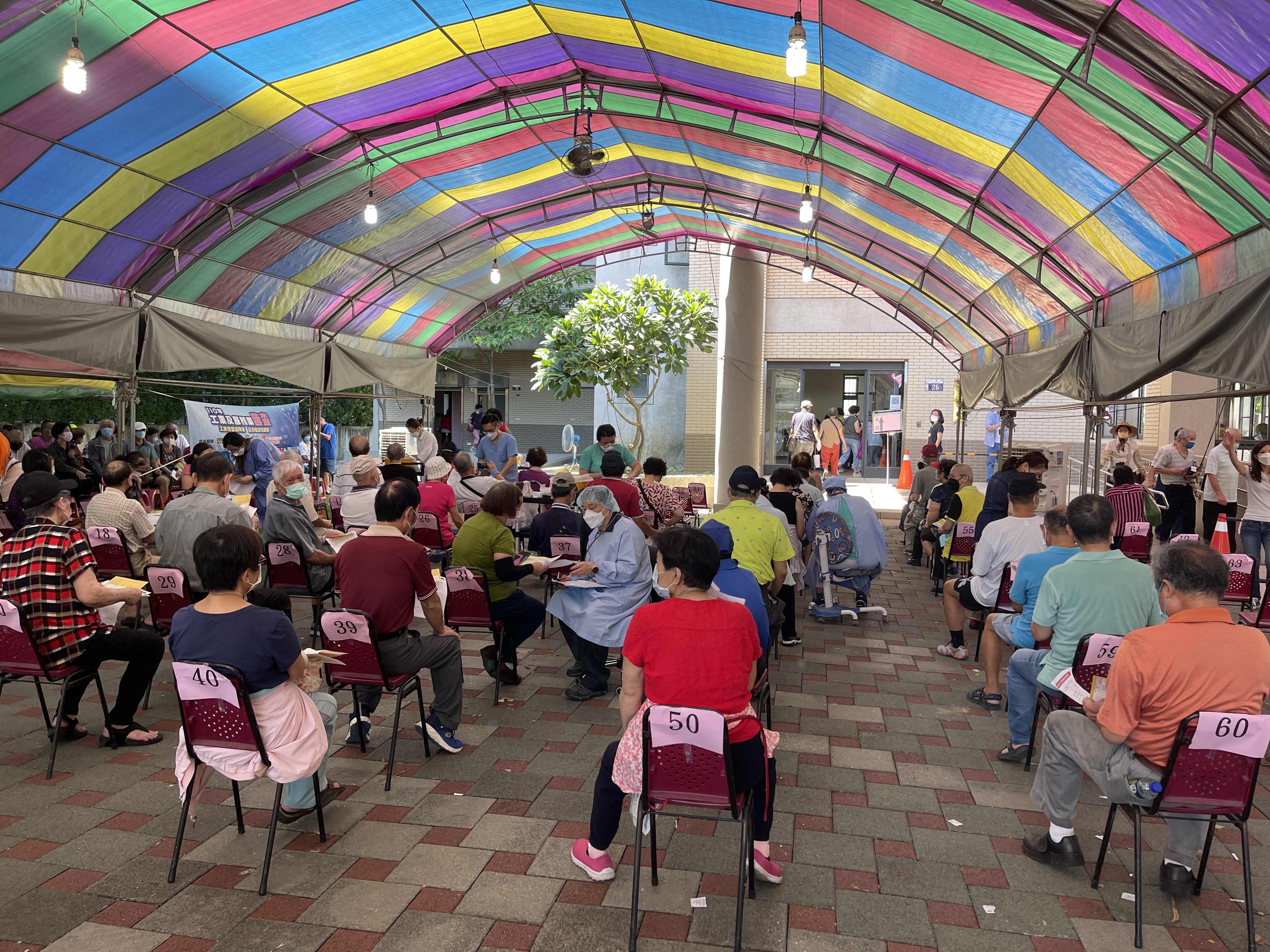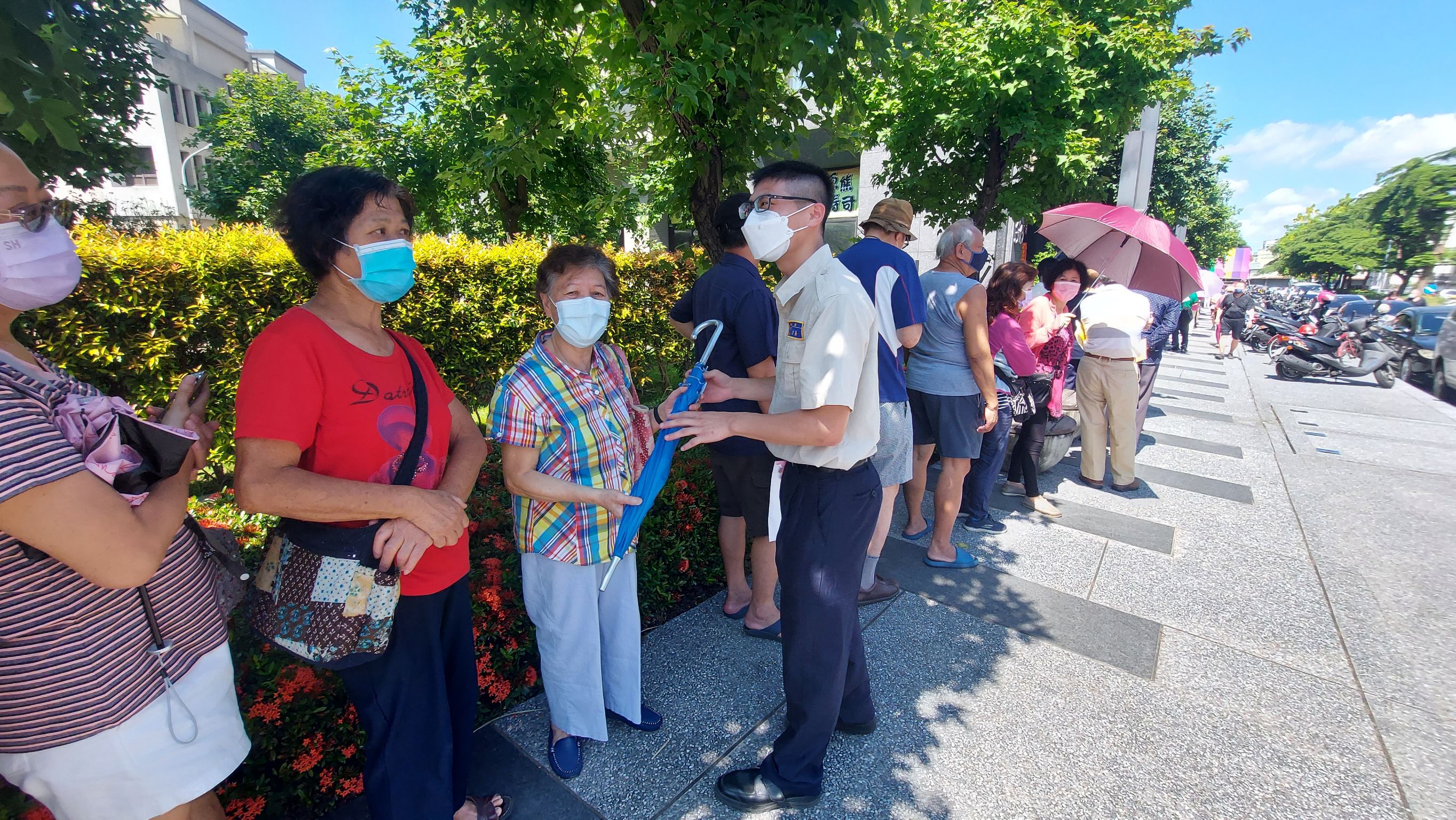 東區區長何宜真說明,感謝各位長輩配合政策、踴躍接種,東區六順多功能活動中心快打站昨日為紓解接種人潮,第一時間即緊急增設5座20呎遮陽棚及2台水冷扇,避免長輩烈日下久候身體不適,同時增派相關人力支援,包括醫護組由3組增為4組、公所及衛生所人力各增加4名,並將報到組人力由3組調整為4組,並重新規劃調整排隊動線,現場秩序、人流獲得改善,有效緩解排隊情形,公所積極調整,全力改善優化接種服務。