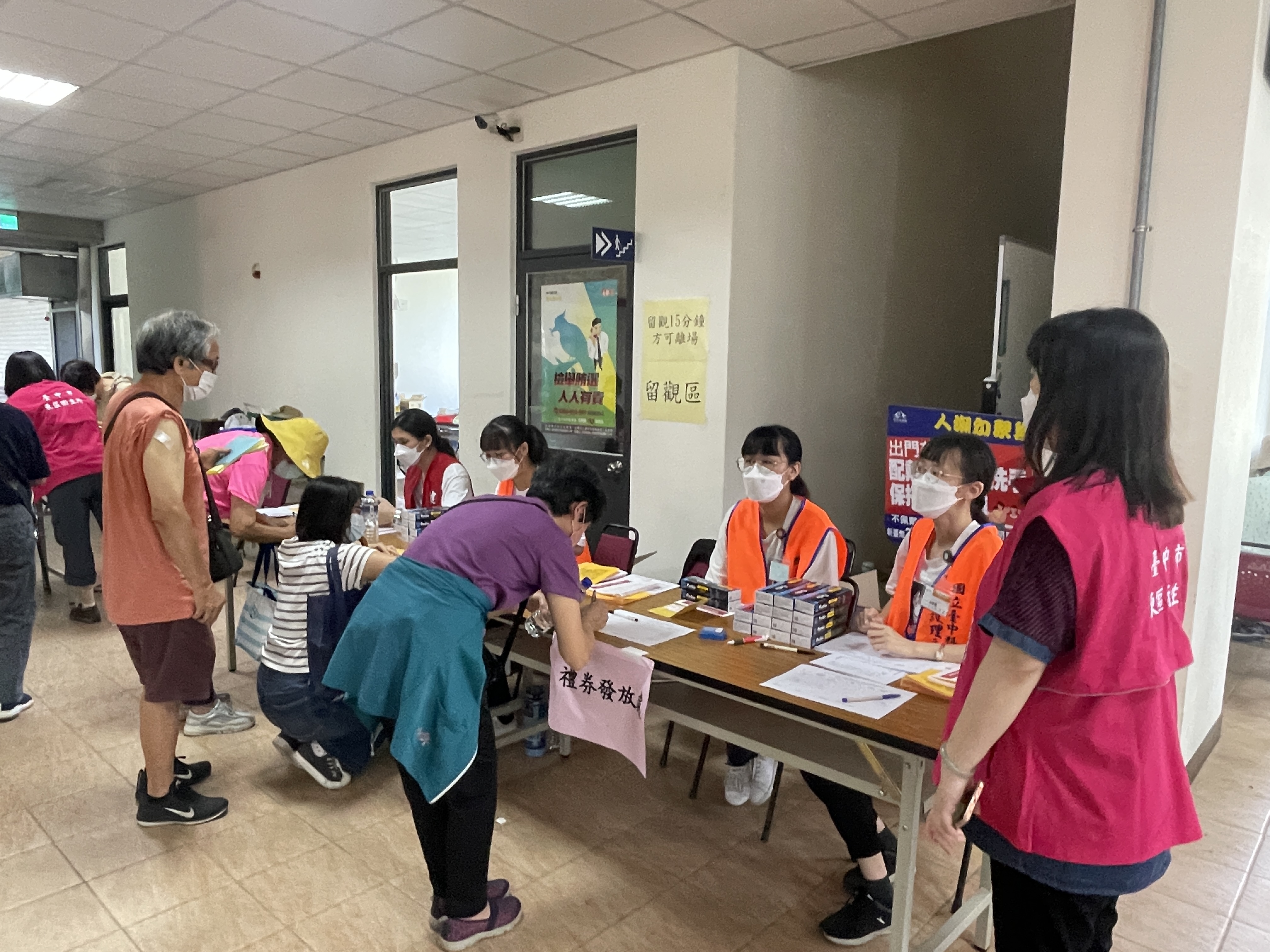 民政局表示,今日各站接種情形大致良好,感謝區公所及各協力機關第一線防疫人員即時應變、優化服務,讓長輩獲得更佳的接種服務,呼籲長輩按「分里、分流」時間前往接種,若到場發現排隊人潮太多,可稍晚再前往,快打站會視接種人潮滾動調整延長服務時間,一定都打得到;另已完成接種未能當場獲得500元禮券者,將由公所登記造冊,擇日專人補送到府,請長輩不用擔心;此外,各醫療院所也有提供疫苗接種服務,一樣會提供中央額外贈送的2劑快篩試劑和500元禮券,歡迎各位長輩多加利用。