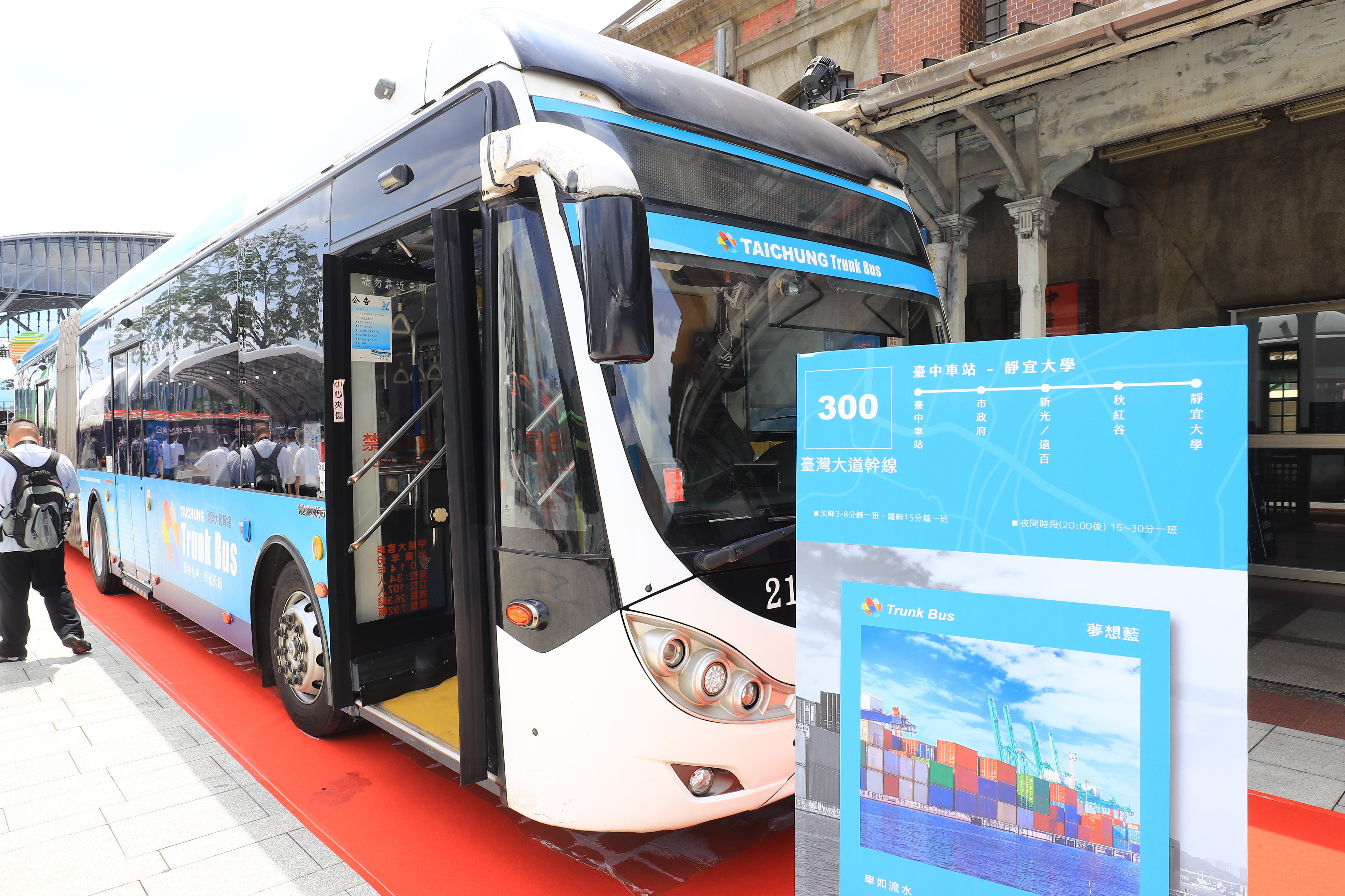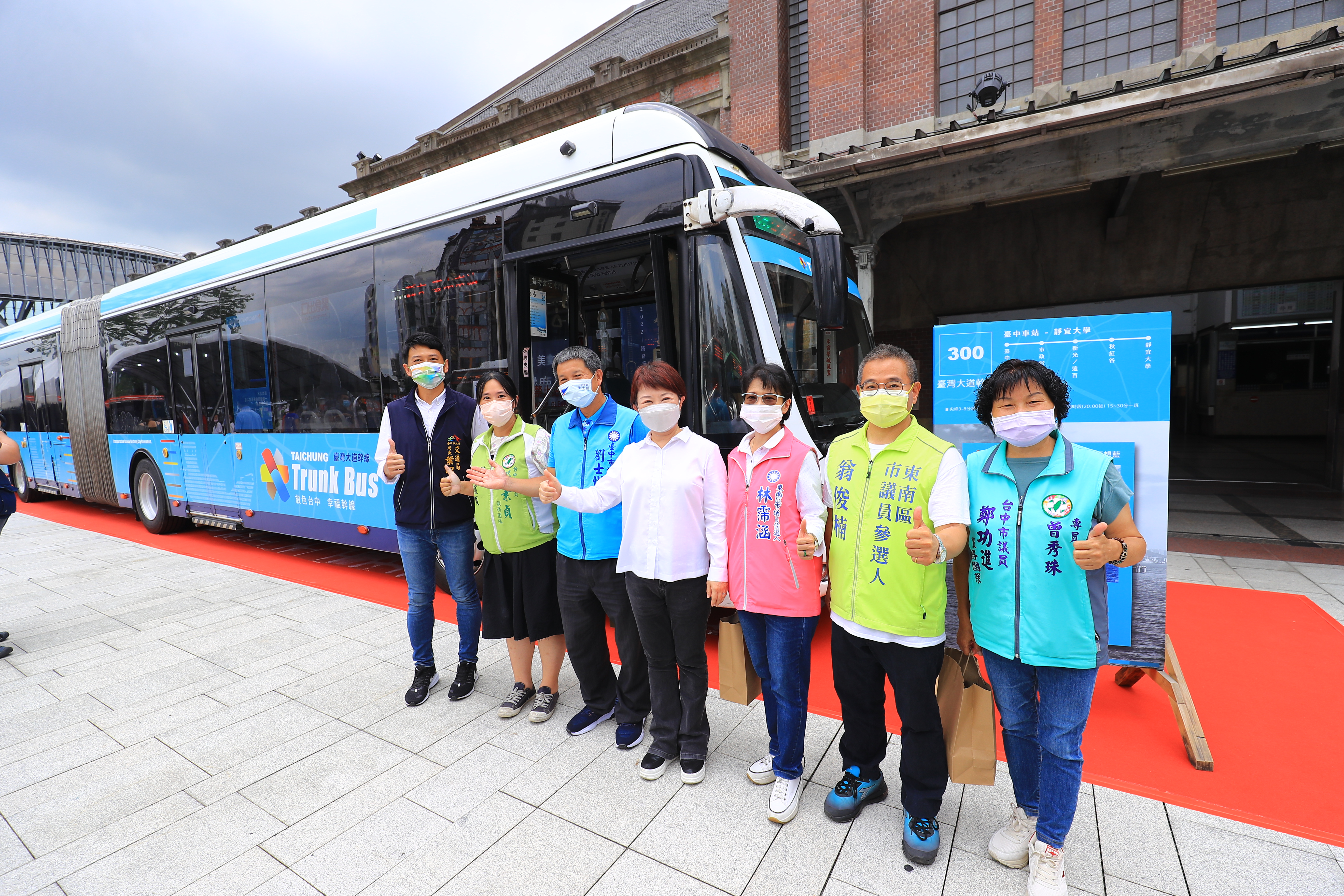 盧市長提到,台中電動公車數量全國最多,六大幹線公車番號分別為100200300500700900,因應搭乘人數提高班次,尖峰10分鐘一班,離峰15分鐘一班,均採低底盤無障礙公車,另以6個顏色加強識別系統,站牌、候車亭等各項設施均統一色系,讓大家容易辨識。