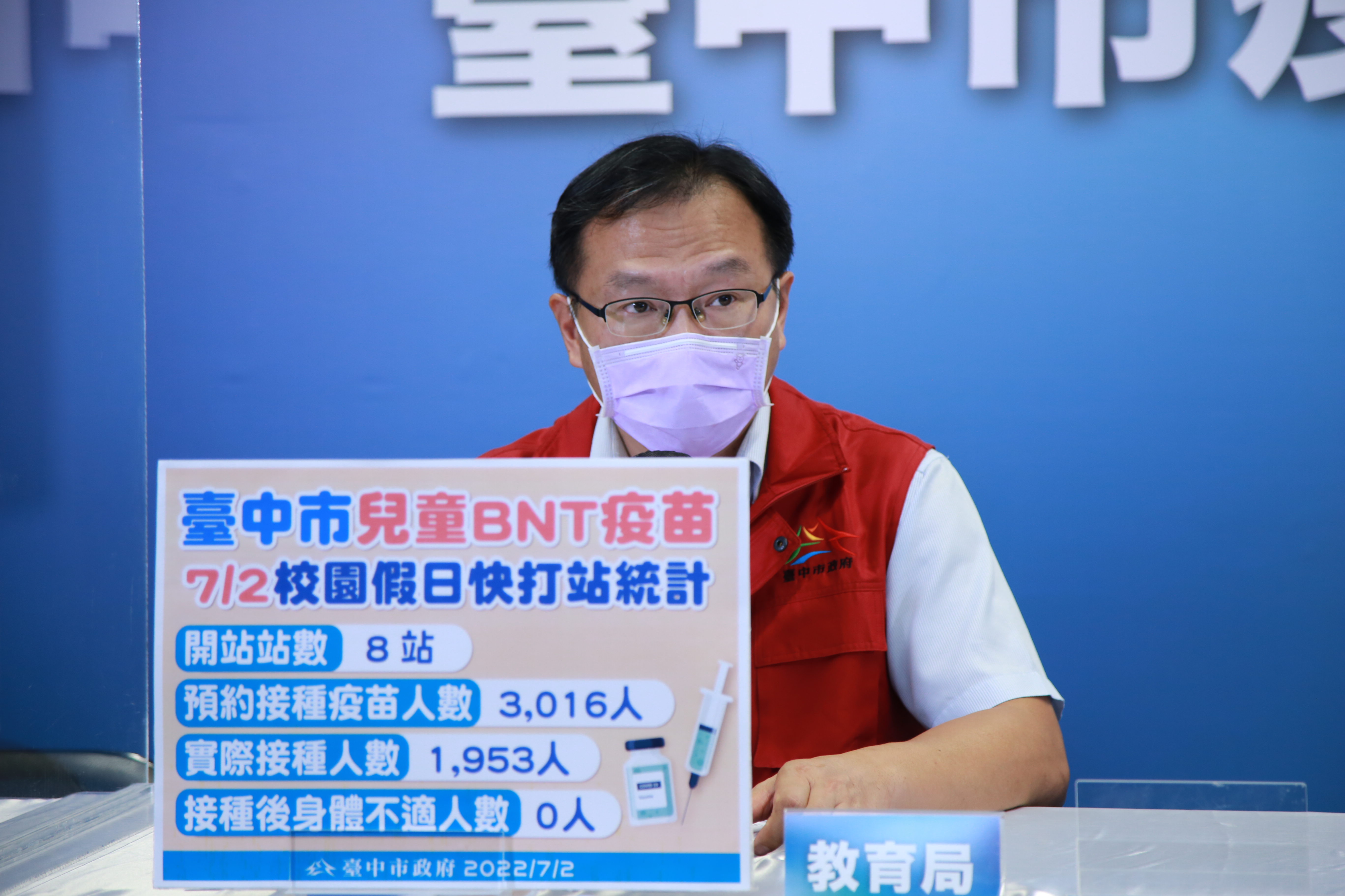 黃副市長提到,市府開設「校園假日兒童疫苗快打站」施打BNT兒童疫苗,日前已於各校統計接種意願,今日共開設8個快打站,並於中午12時前陸續接種完畢,今日預約接種疫苗3,016人,實際接種1,953人,校園兒童快打站的到打率為64.7%,現場孩童接種後皆無身體不適狀況發生。