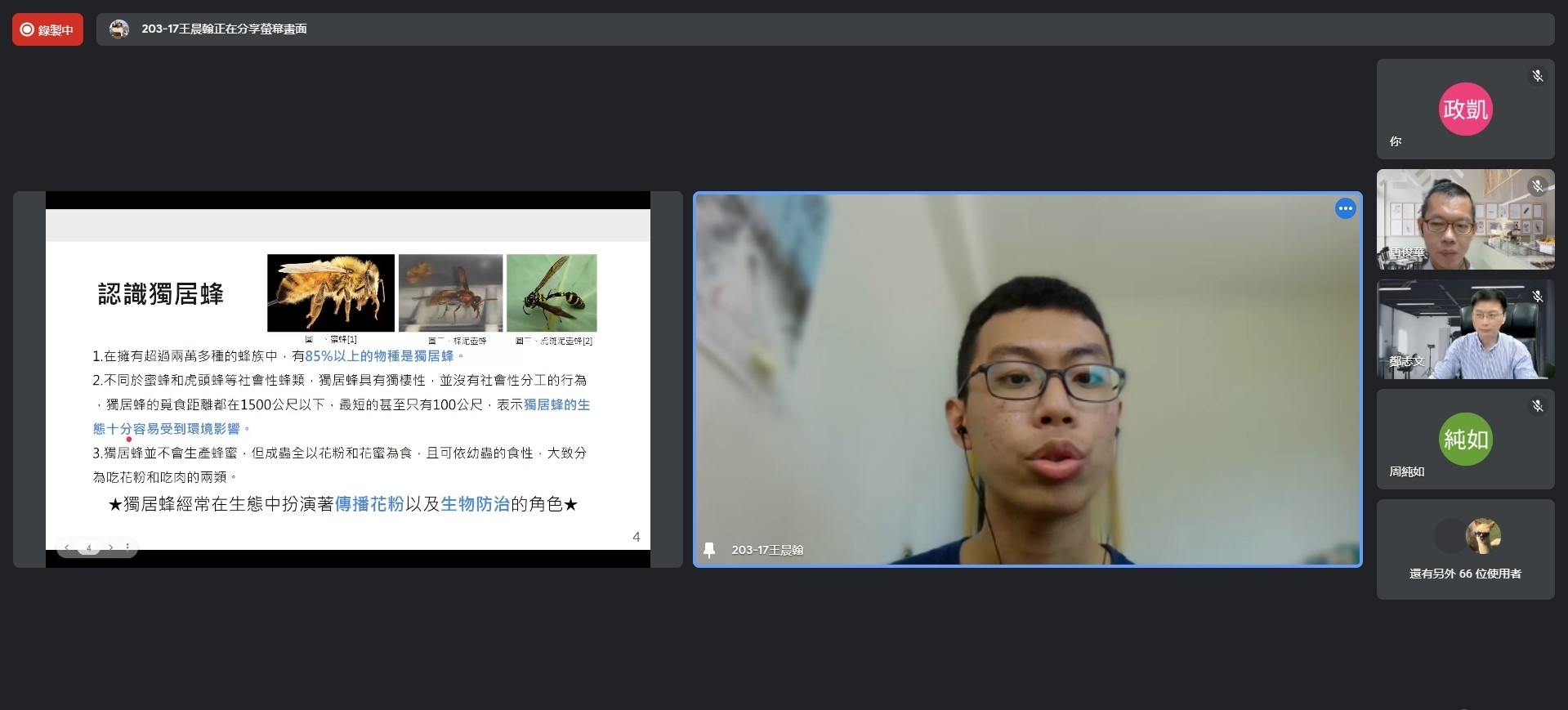 另外,中科實驗高中王同學,因為親戚經營養蜂場,在一次機緣巧合看到網站「城市養蜂是bee要」,他透過觀察校內獨居蜂築巢行為及在居家實做獨居蜂旅館,分別探討環境對築巢行為的影響與溫度對羽化時間的影響程度。