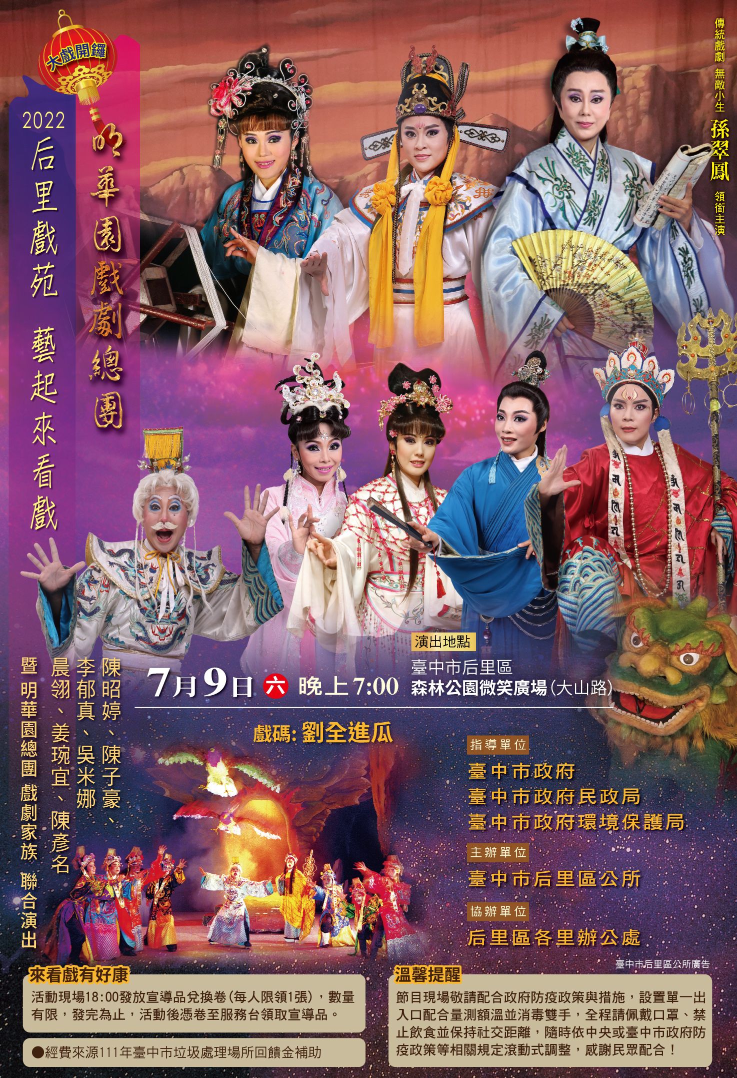 台中市后里區公所今(9)晚在后里森林公園微笑廣場舉辦「2022后里戲苑-藝起來看戲」,邀請知名明華園戲劇總團當家小生孫翠鳳領銜主演經典戲曲《劉全進瓜》,高潮迭起的劇情和精彩絢麗的舞台效果,吸引民眾攜家帶眷前往欣賞。市長盧秀燕為感謝明華園戲劇總團帶來精彩演出,今晚將親自出席表達力挺之意。