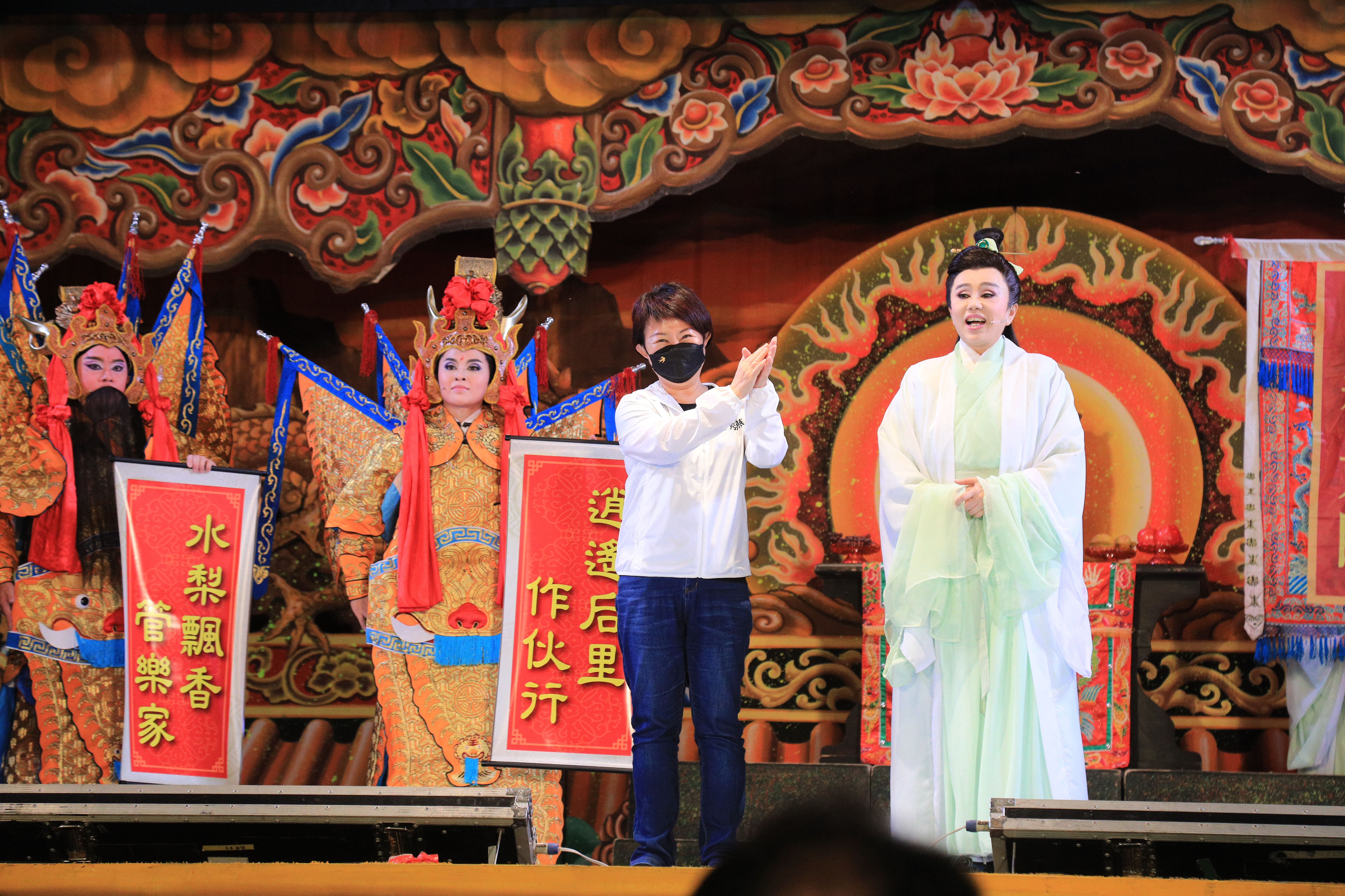盧市長表示,感謝明華園總團長陳勝福及天王小生孫翠鳳老師,夫妻兩人攜手同心,才創造台灣最高的藝術明華園歌仔戲團為國爭光,站在世界的舞台。在眾人的努力下,疫情逐漸平緩,民眾因此能正常生活,為感謝大家的努力,市府特別邀請明華園歌仔戲團,只要繼續認真防疫,就能欣賞更多藝文活動。