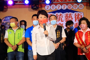 台中市政府文化局今(10)晚在大里區金城宮舉辦「2022台中市傳統藝術巡演活動」,邀請文化部優良扶植團隊「九天民俗技藝團」與台中市在地團隊「震樂堂」同台演出搖滾廟會,精彩的跨界合作帶給現場觀眾沸騰的視聽覺藝文饗宴。市長盧秀燕到場支持傳統藝術,並頒贈「保境佑民」匾額,感謝大里金城宮長年對地方的貢獻。