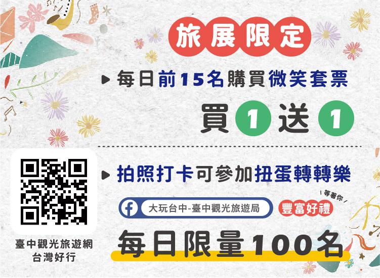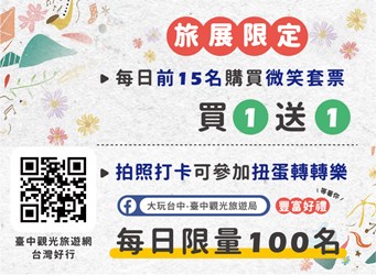 觀旅局指出,現場更祭出「台灣好行台中時尚城中城線」童趣玩樂的旅優惠套票,每日前15名加碼買1送1,購買套票還可參加扭蛋轉轉樂活動,有機會獲得限量時尚小黃傘及精美小禮物。另也規劃1元競標、限時搶購、大玩台中Line OA互動促銷等好禮抽獎活動,同時精心安排「大玩台中」轉轉樂遊戲,只要到台中館參與活動,限量版口罩及精美紀念品通通帶回家。