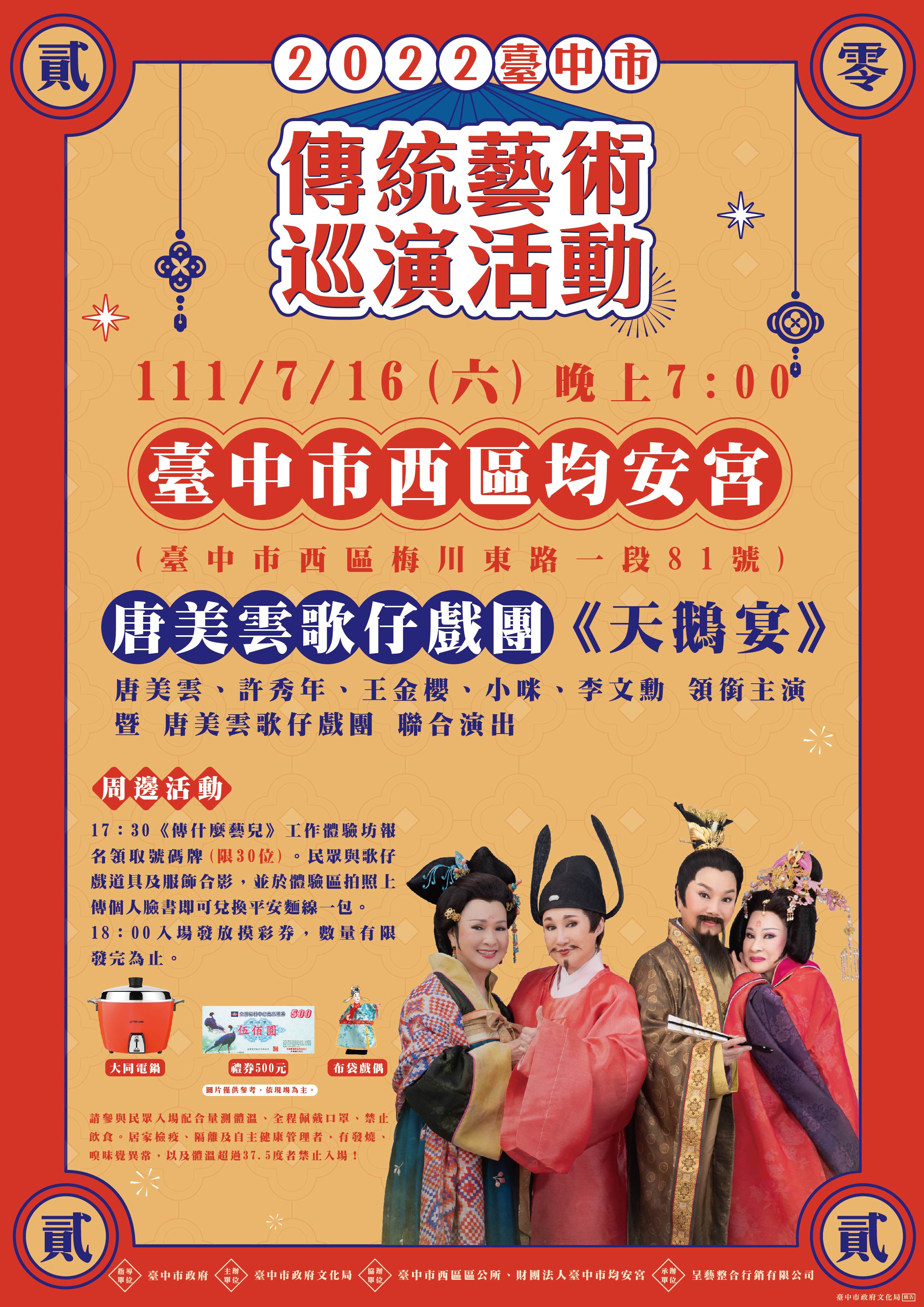 台中市政府文化局舉辦「2022台中市傳統藝術巡演」系列活動,今(16)日晚上7時將於西區均安宮登場,邀請文化部公布的台灣品牌團隊「唐美雲歌仔戲團」首次於戶外演出經典大戲《天鵝宴》,包括唐美雲、許秀年及「人間國寶」王金櫻、小咪等四大名角齊聚台中,市長盧秀燕將出席支持,歡迎民眾在遵守防疫規定下,把握機會一起來看好戲。