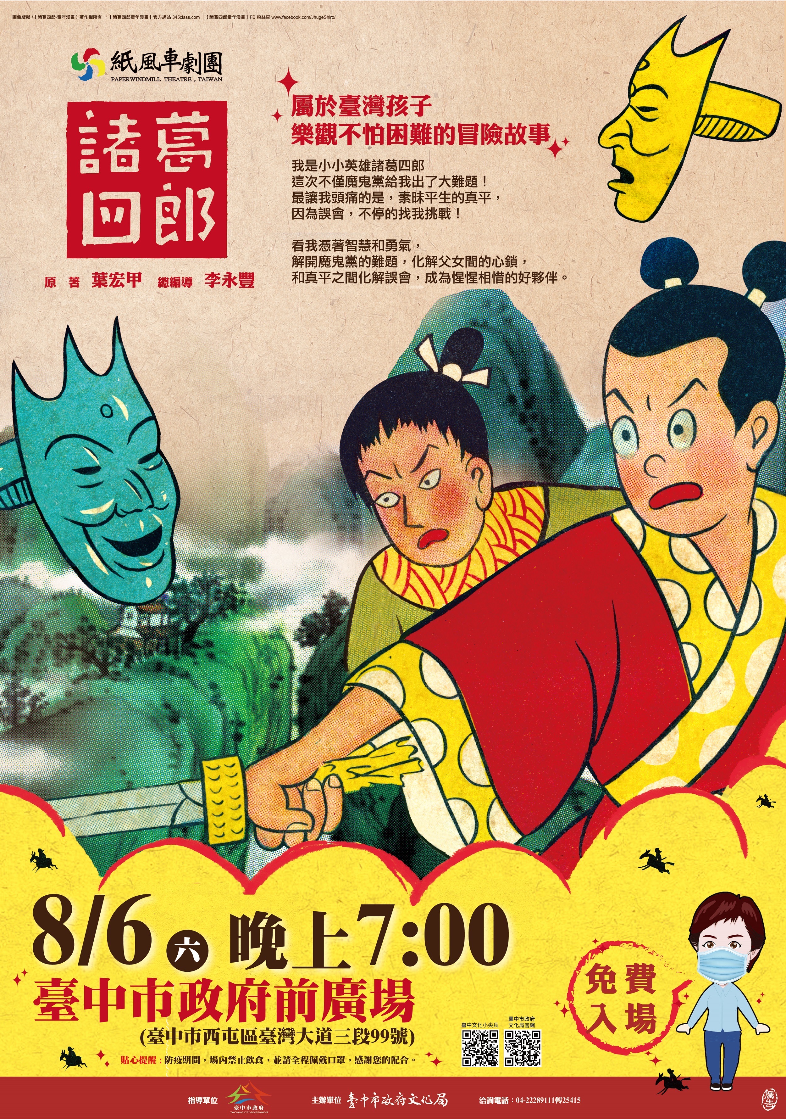漫畫英雄《諸葛四郎》陪你過暑假!台中市政府邀請備受大家喜愛的紙風車劇團,8月6日晚上7時將於市府前廣場演出《諸葛四郎》兒童劇,改編自台灣經典漫畫英雄串起三代情的精采故事,劇團以現代動漫造型結合古裝人物,並融合傳統武打、現代街舞、古典音樂及多媒體動畫,整場演出將高潮迭起,活動免費入場,歡迎民眾闔家一起來看戲,共度熱鬧的夏日夜晚。
