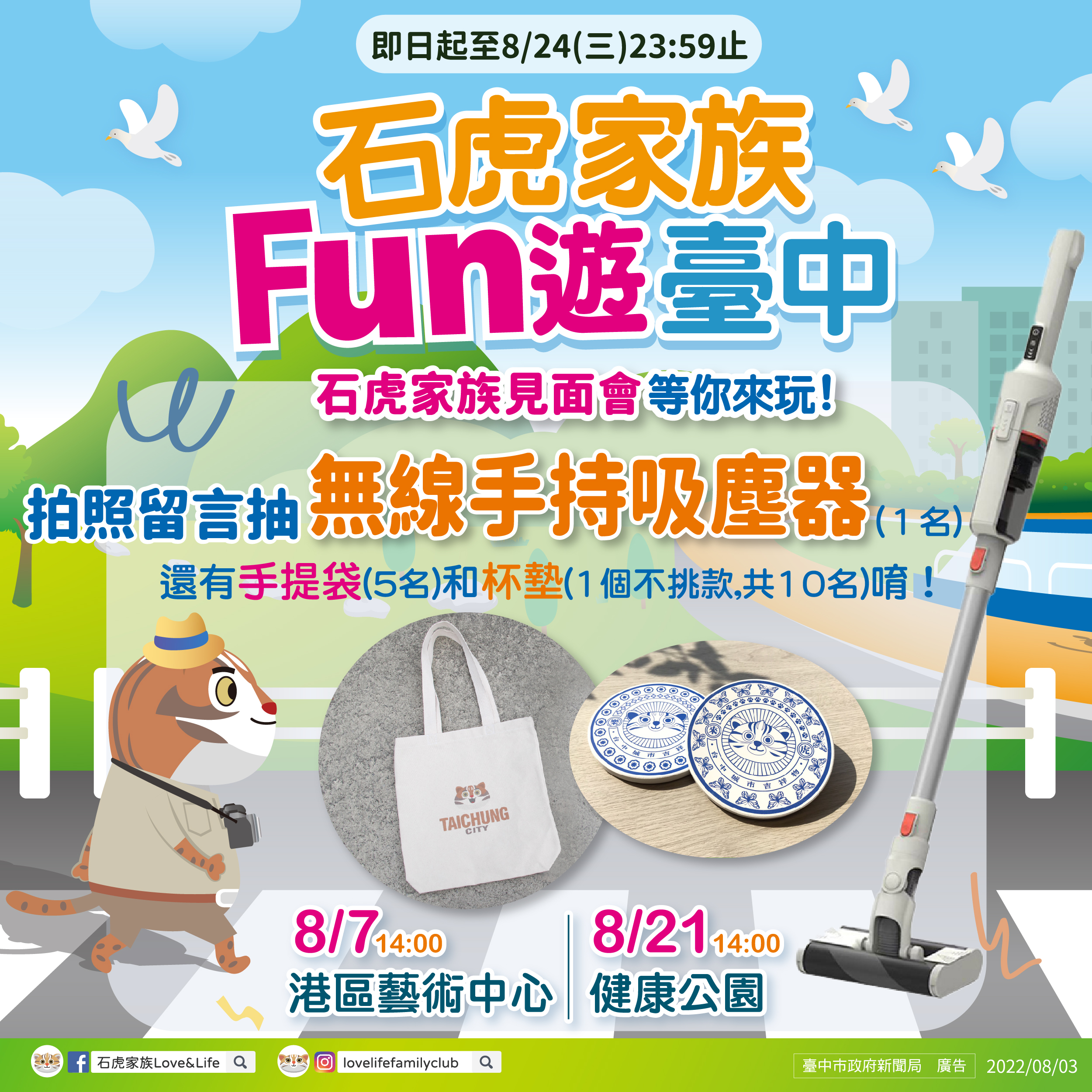 新聞局表示,「石虎家族FUN遊台中」活動,將於8月7日下午14時在台中市港區藝術中心、8月21日下午14時在南區健康公園熱鬧登場,石虎家族也加碼抽好禮,參加見面會還可以參加抽獎。活動免費自由入場,歡迎大家踴躍參與。台中大眾運輸便利,歡迎多多使用,也提醒疫情期間仍要戴口罩、勤洗手,保護自己與家人的健康,活動詳情請見「石虎家族Love&Life」粉絲團( https://www.facebook.com/lovelifefamilyclub/ )。 (8/4*17)*新聞局