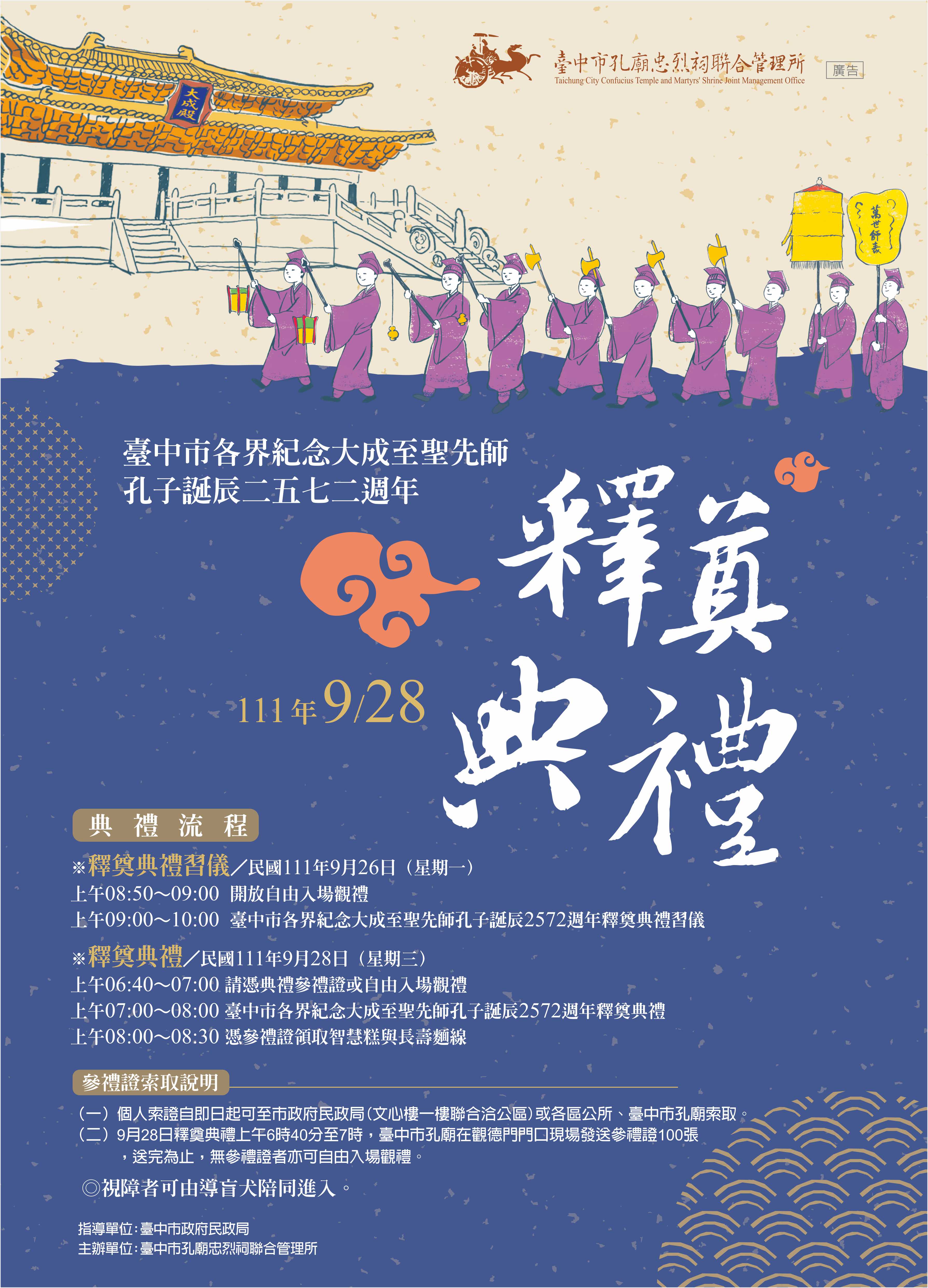 台中市孔廟將於9月28日上午7時舉行「台中市各界紀念大成至聖先師孔子誕辰2572週年釋奠典禮」,今(12)日起開放民眾預先索取參禮證,民眾可至市府民政局(台灣大道市政大樓文心樓1樓聯合洽公區)、各區公所或台中市孔廟索取參禮證,每人限領2張,發完為止,歡迎市民共襄盛舉。