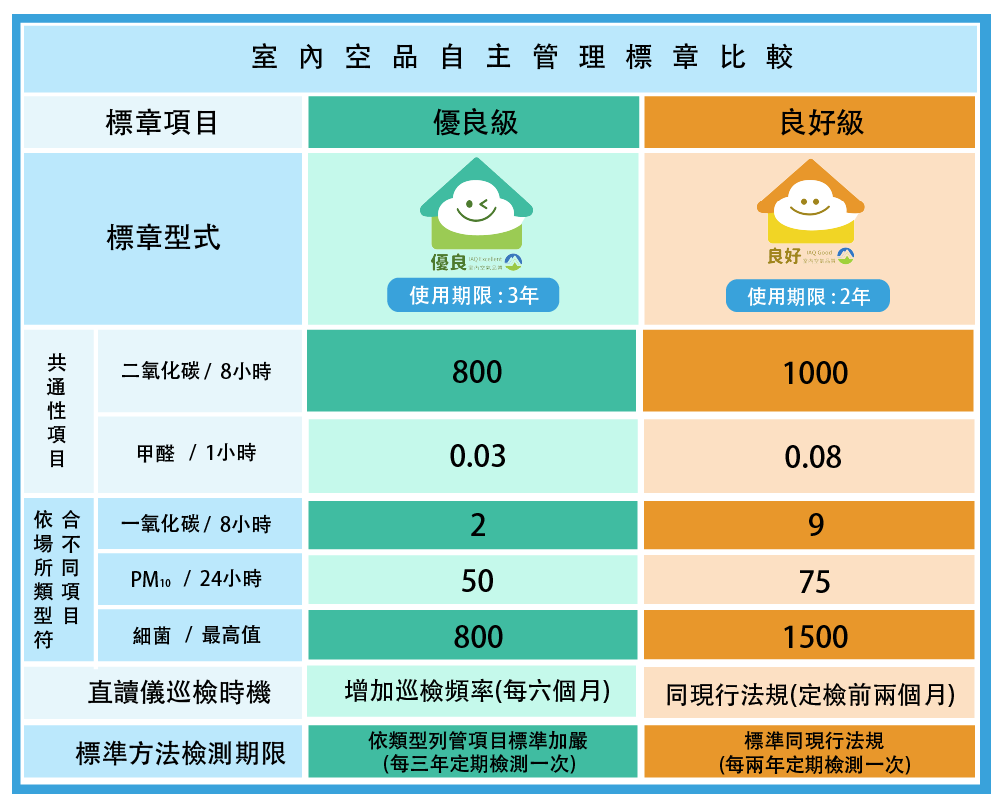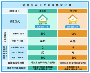 此外,為鼓勵公私場所取得優良級標章,除可獲得環保綠點及提升企業形象外,場所提供休閒或消費皆有益提升民眾滿意度;另針對台中市應符合室內空氣品質管理法的公告場所,若自主由良好級標章提升為優良級標章,其定期檢測頻率可延長為3年1次及減少採樣點數降低維護管理成本,並提升企業良好形象外;而環保局也會不定期追蹤查核及室內空品檢測,以了解各場所落實程度,維護公眾健康。