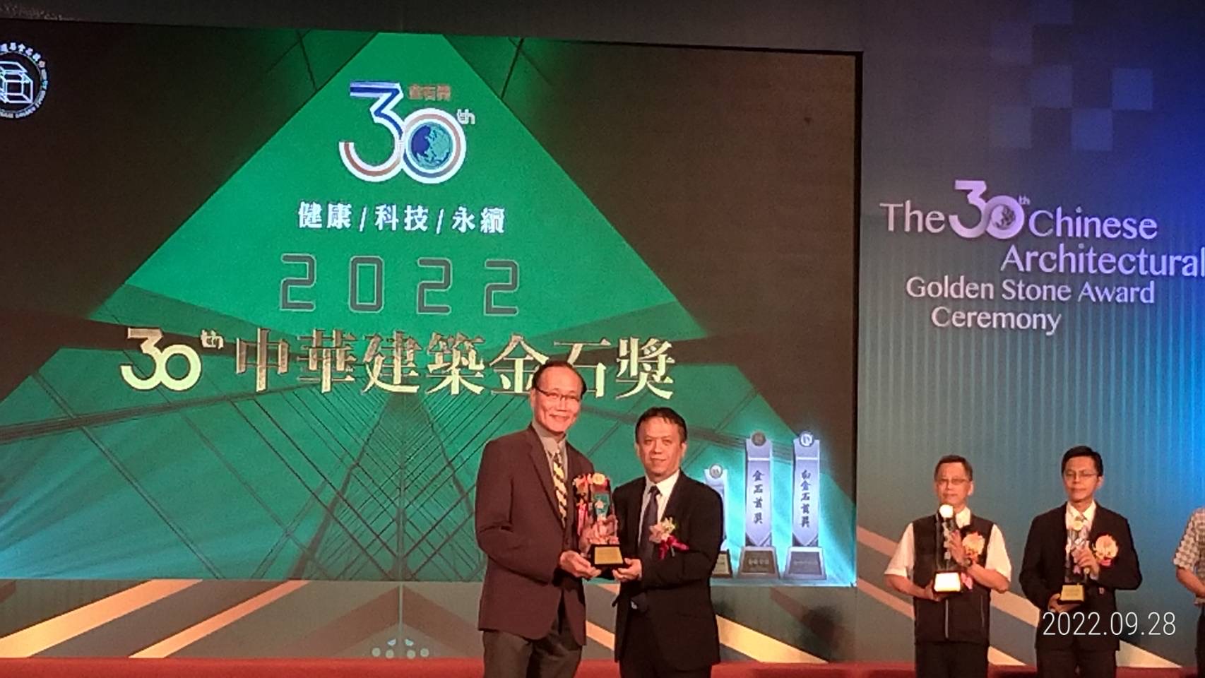住宅處補充,中華建築金石獎活動委員會(CHINESE ARCHITECTURAL GOLDEN STONE AWARD CONTEST ADVISORY BOARD)成立至今已邁入第30年,為目前台灣建築甄選活動中最資深的、最具權威的獎項之一,評審項目分為施工品質類、規劃設計類、卓越品牌標竿企業、公共建設/空間活化類、傑出建築師獎等五大類,以生態觀、綠發展觀、環境共生觀來規劃環境,以建設優質環境為目標。(9/29*6)*住宅處