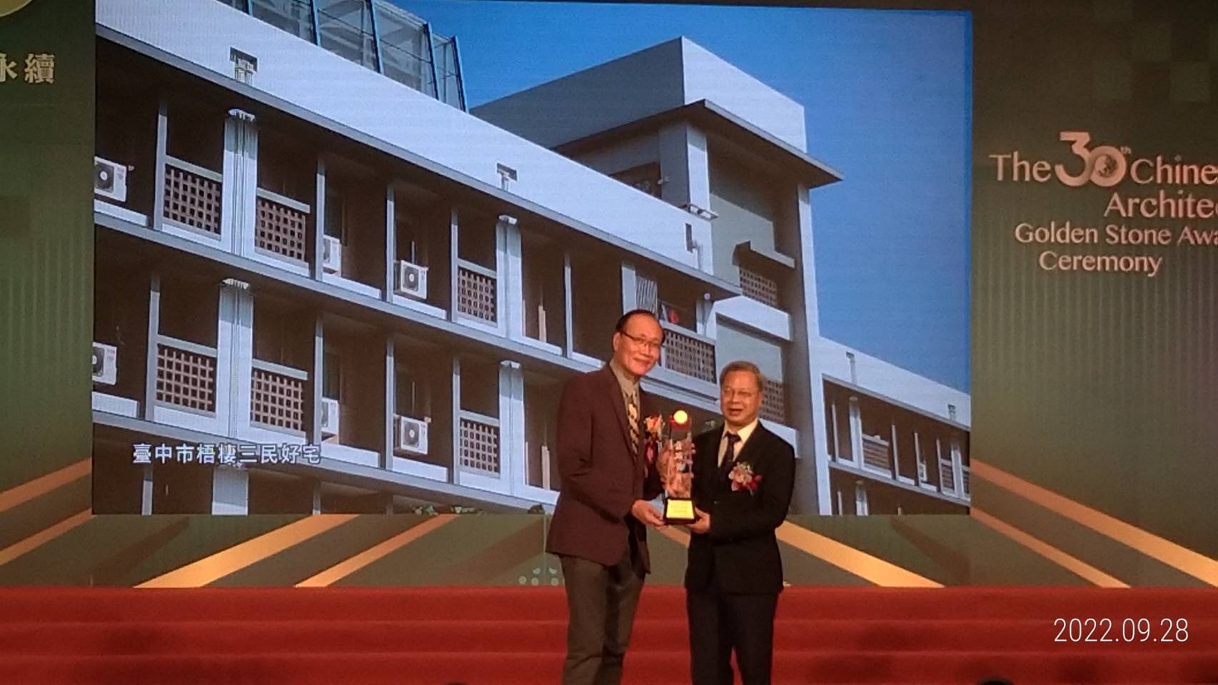 台中好宅近期捷報不斷,近日才剛獲「2022年國家卓越建設獎」及「2022建築園冶獎」公共建築景觀類等大獎肯定,今(28) 日「梧棲三民好宅」及「東區尚武好宅」又榮獲第30屆「中華建築金石獎」優良公共建設/優良空間活化類-施工組及規劃組金石獎的殊榮,其中「梧棲三民好宅」更獲該組金石首獎肯定。住宅處感謝評審及協會肯定,也將持續精進居住空間及友善公共環境品質,打造更多台中好宅,讓台中市成為宜居、移居的城市。