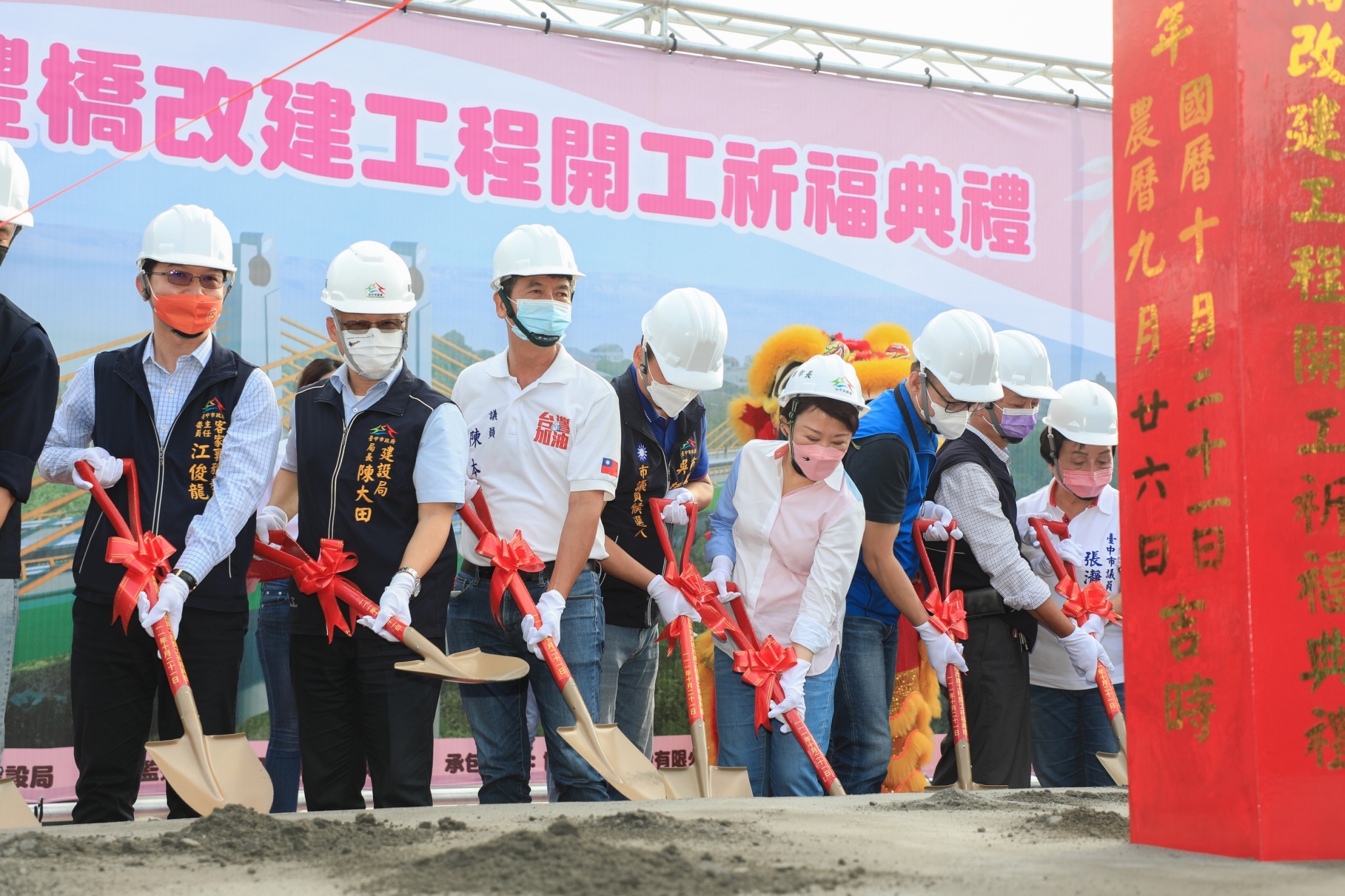 今日開工典禮,盧市長、立法委員江啟臣、市議員張瀞分、冉齡軒、陳本添、謝志忠、建設局長陳大田、市府客委會主委江俊龍、東勢區長翁培真、豐原區長洪峰明、石岡區長劉素幸、新社區長林淑惠及東勢、豐原、石岡在地多位里長等均出席,市議員陳清龍、蔡成圭也派代表共襄盛舉。(10/21*7)*建設局