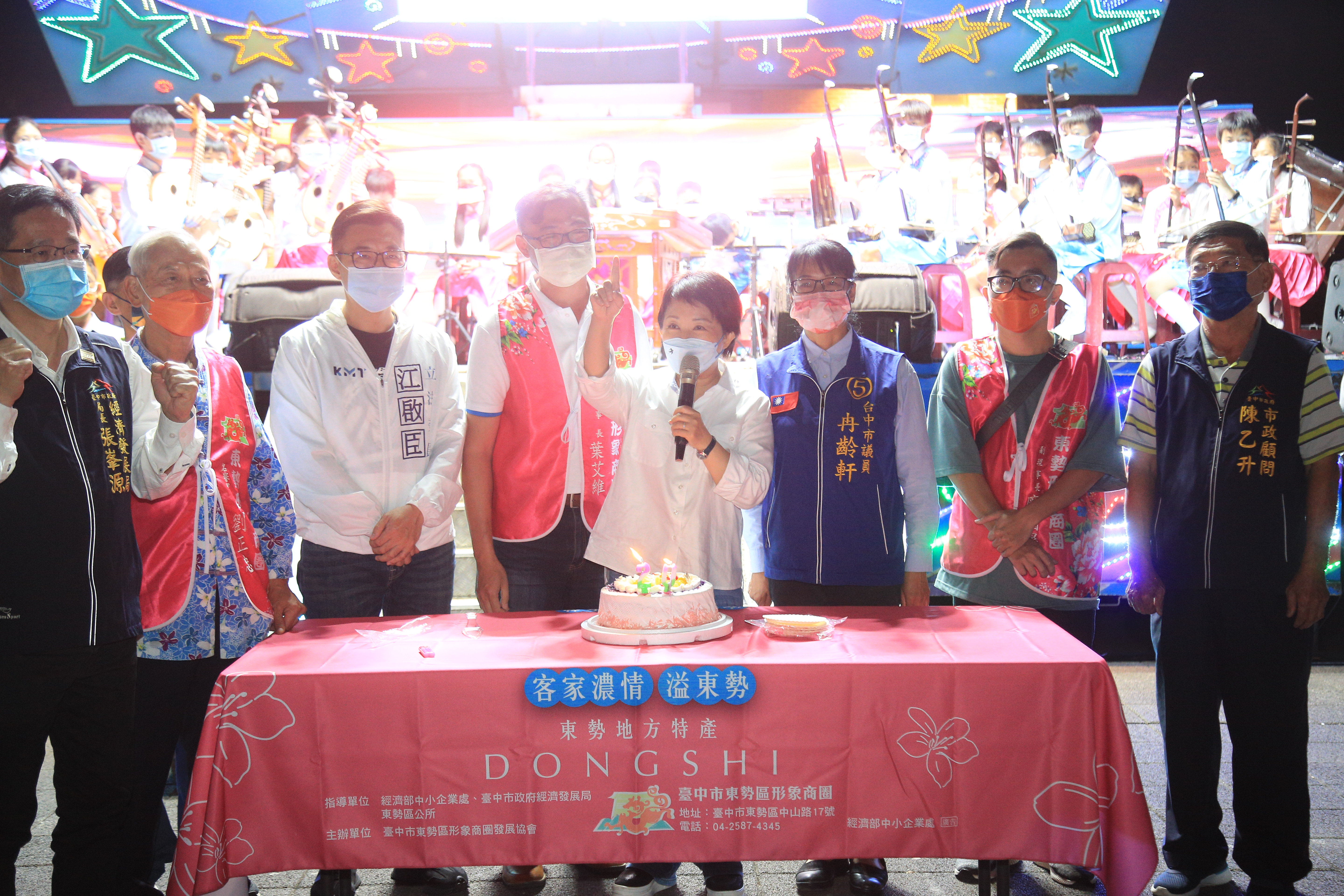 台中市東勢區形象商圈今(26)晚舉辦歡慶「魅梨無邊勢不可擋」20週年活動,市長盧秀燕出席祝賀東勢商圈生日快樂,也祝福在場商家、鄉親未來都能鴻圖大展、生意興隆;盧市長今日也分享2大好消息,一是投入150億元經費的東豐快速道路下個月將要復工,二是台中市在全國22縣市經濟統計數據奪冠,成績豔壓群雄;市府將持續努力,也盼帶動東勢地區經濟長紅、邁向下一個20年。