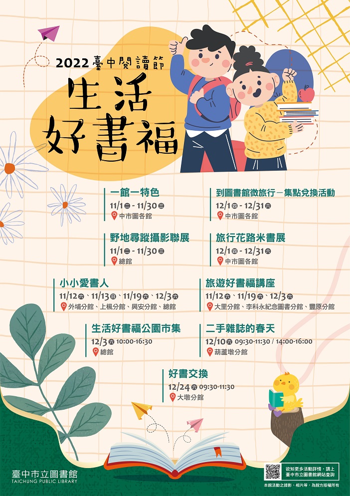 「2022台中閱讀節」系列活動11月將開跑,今年將旅行及閱讀升級成「旅讀」,由台中市立圖書館和所屬44個圖書館同步推出「一館一特色」,展現多元閱讀風貌,同時邀請知名作家、獨立書店等分享旅讀中帶來的「書福」感動,並策劃書展、展覽、好書交換、生活好書福公園市集等,系列活動將持續至12月底,歡迎民眾一起旅讀台中市各區圖書館,享受「書福」好生活。