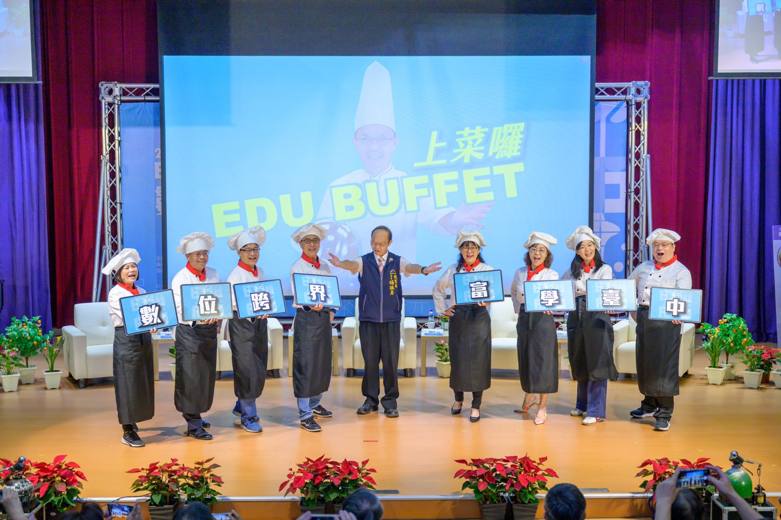 楊局長進一步說明,下午安排41場次全線上課程,包含「EDU-BUFFET夢想家─數位學習新風貌」、「EDU-BUFFET教育家─教學卓越亮台中」、「EDU-BUFFETt領航家─課程研創心視野」等系列共41堂課程,各縣市教師或家長只要在家打開電腦,就能依照個人需求自由「點餐」選擇課程,跨越地域限制,即時線上交流。(11/12*10)*教育局