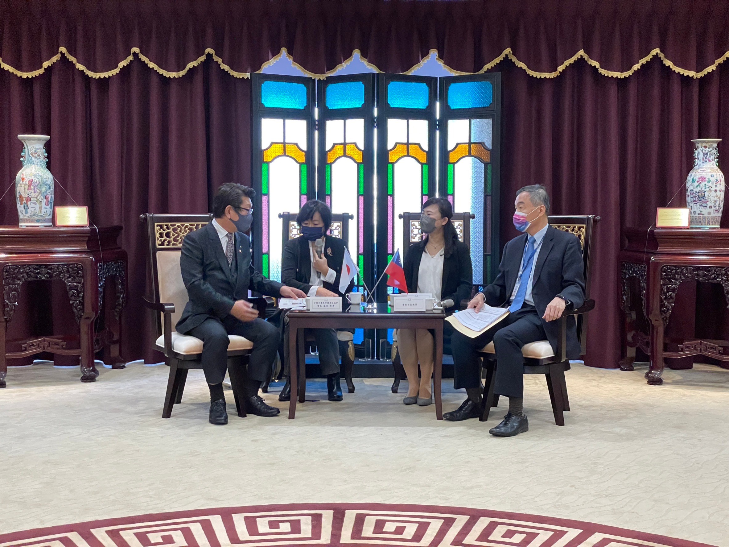 會後藤田會長致贈「有松・鳴海絞」桌巾飾品予黃副市長,並邀請黃副市長來名古屋市「有松」小鎮,體驗流傳400年成為日本遺產的染織工藝文化;市府則回贈充滿台日歷史意義的台中公園湖心亭漆器。(12/10*10)*觀光旅遊局