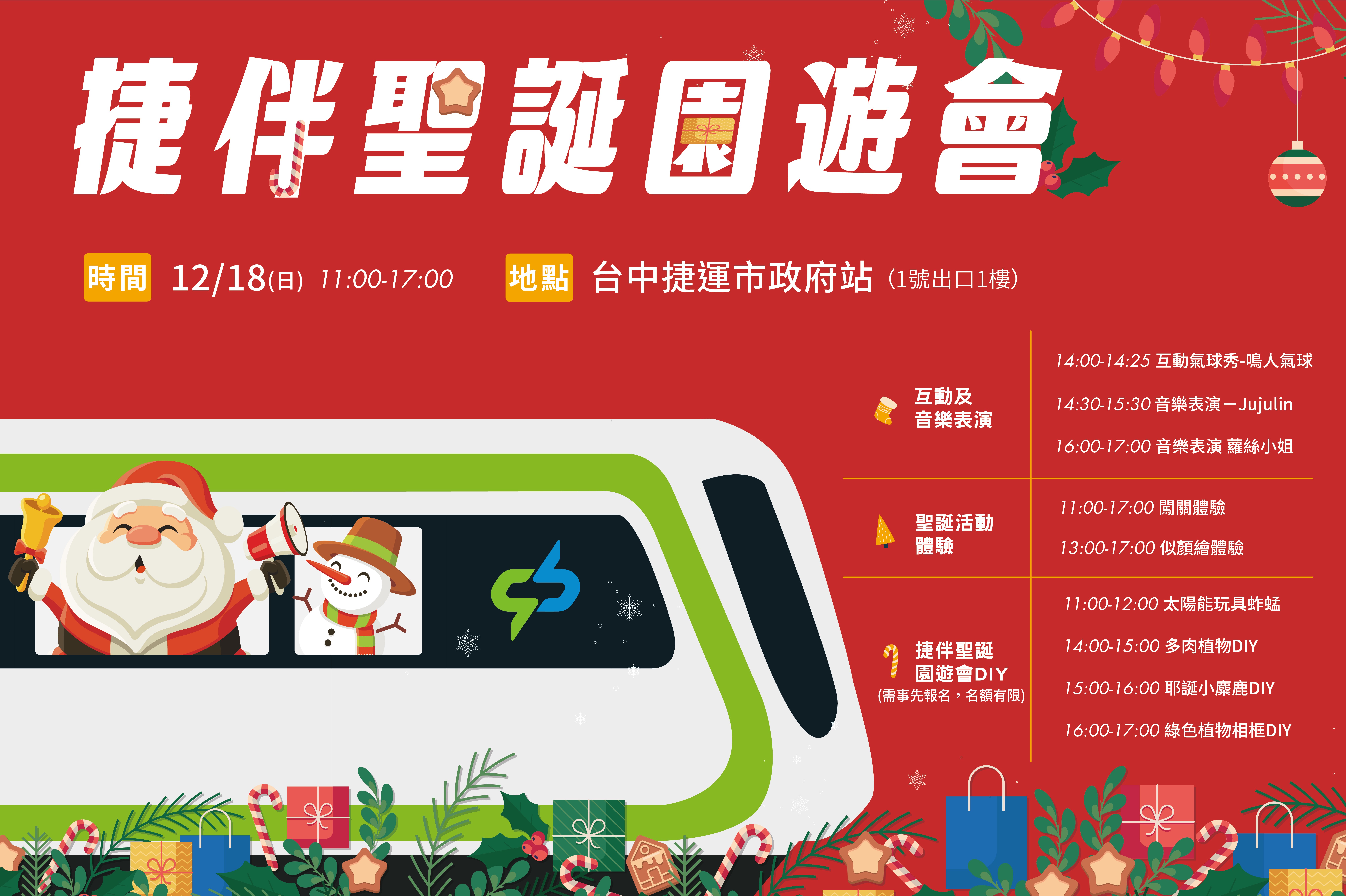 中捷公司指出,「捷伴聖誕園遊會」訂於18日上午11時起登場,精彩節目持續至下午5時,現場共規劃3大活動區域,分別為「捷伴聖誕園遊會DIY區」、「聖誕活動體驗區」、「互動及音樂表演區」。