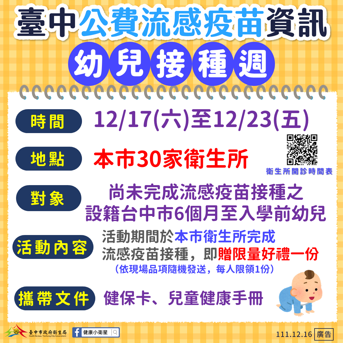 衛生局補充,幼兒接種週及幼兒BNT疫苗門診相關資訊請至衛生局網站( https://www.health.taichung.gov.tw/ )查詢,或電洽全市各區衛生所,流感疫苗數量有限,用罄為止,建議民眾施打前先洽詢衛生所,也歡迎祖孫一同前往接種,提升家庭整體保護力。(12/16*6)* 衛生局