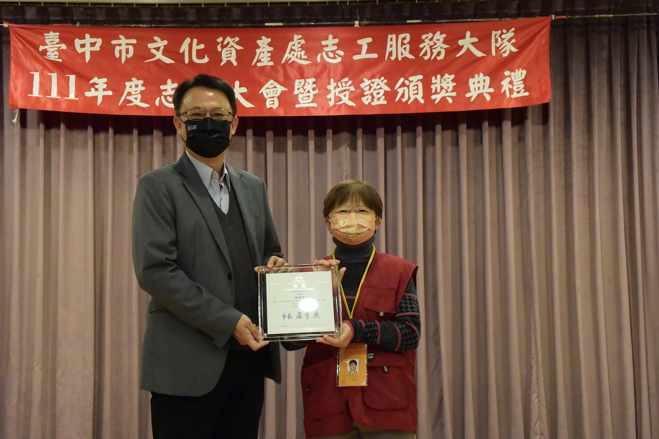 施副局長表示,歷年來志工夥伴們的導覽服務範圍遍及全市,為社會大眾提供專業深入的導覽解說,成為維護和推廣台中市文化資產的重要推手,此外,台中市文資志工不只守護著台中的文化資產,在疫情期間還守護著民眾的健康,感謝志工夥伴的熱心與奉獻。