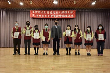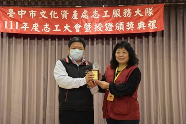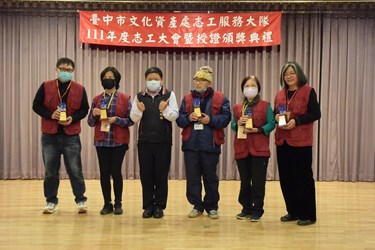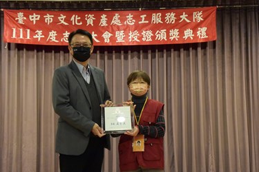 台中市擁有豐富的古蹟和歷史文化資產,台中市政府為讓民眾進一步瞭解其歷史脈絡及珍貴性,自101年成立文化資產志工服務隊,至今屆滿10週年。市府文化局昨(17)日於大墩文化中心舉辦「111年度文資志工表揚授證典禮」,由副局長施純福頒獎表揚年度特殊貢獻獎、全國志願服務獎得主及服務滿10年的志工,並感謝文化資產志工服務隊的付出和貢獻。