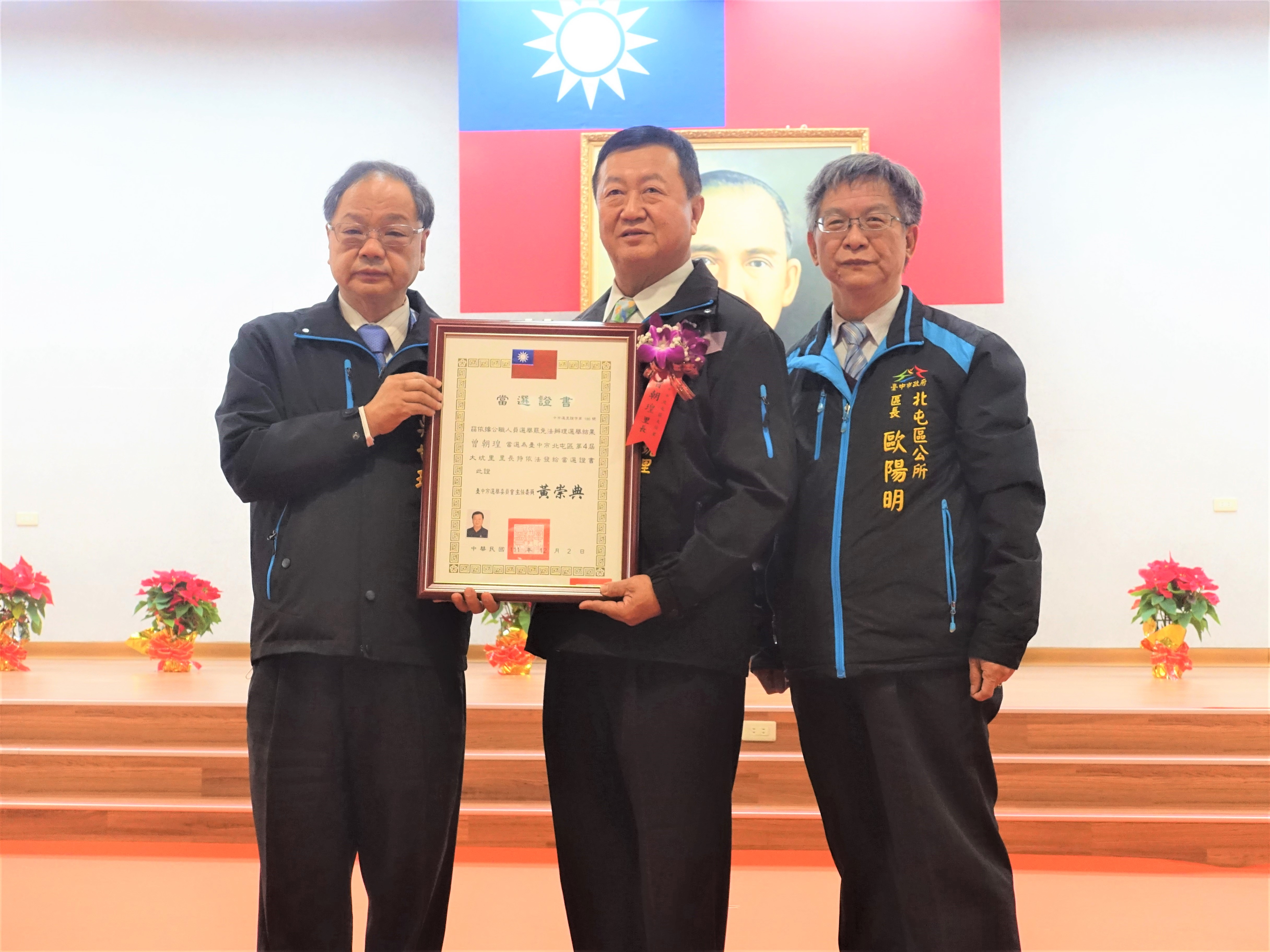 台中市北屯區公所今(25)日舉辦北屯區第四屆里長就職典禮,其中37位里長連任成功,另平興里長黃彰國、民德里長江承鴻、松竹里長簡禎緯、北興里長廖玉森及舊社里長謝秉憲等5位為此屆新任里長,42位里長齊聚一堂,由民政局長吳世瑋及北屯區長歐陽明共同頒發當選證書。吳局長表示,恭喜42位里長順利當選,期許各位里長發揮視民如親的精神,共同打造幸福美好新北屯。