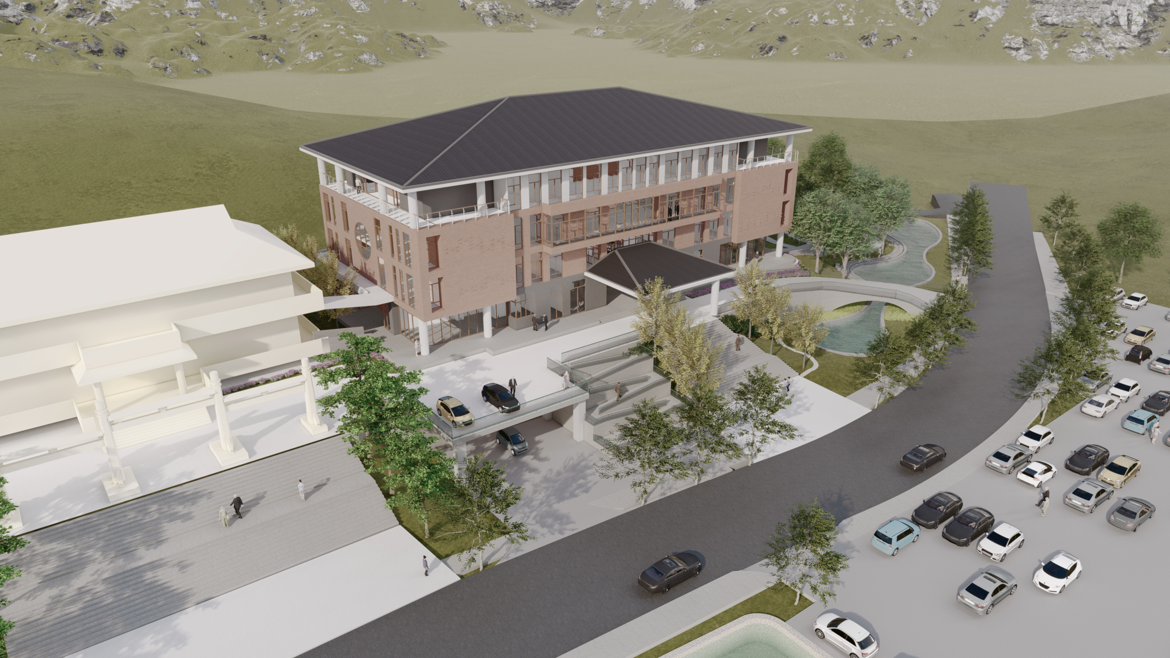陳局長進一步說明,本工程基地面積8,489平方公尺,預算為新臺幣3億2,500萬元整,規劃為地上四層建築物,一樓為服務中心、家屬休息室、祭祀大廳、骨骸櫃區、廁所及行政辦公室,二樓至四樓為骨骸櫃區、骨灰櫃區、牌位區及家屬休息室,總樓地板面積為4991.19平方公尺;地面層空間為停車場及室外景觀滯洪池,提供停車位82輛,預計114年工程完工後,115年啟用。設計以遊園概念串聯殯葬園區空間序列,靜謐優雅之街道步行空間,觀景、駐留、活動性質兼具的戶外空間,與基地周遭環境協調融合,創造莊嚴優質舒適空間,提供家屬民眾散心懷念的場域。